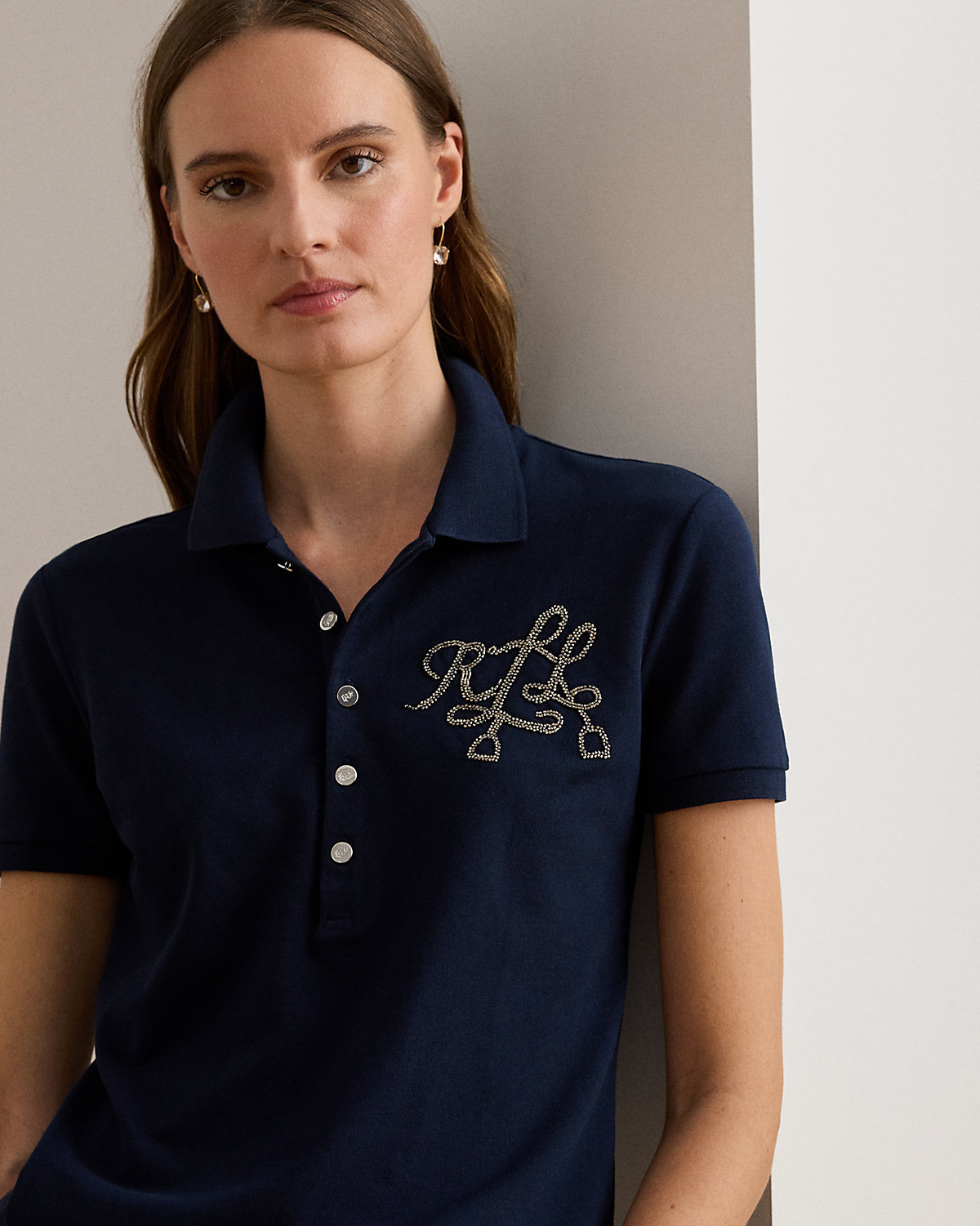 - Ribbed Polo collar. Five-div placket. Metal divs custom-developed with an “LRL” logo.