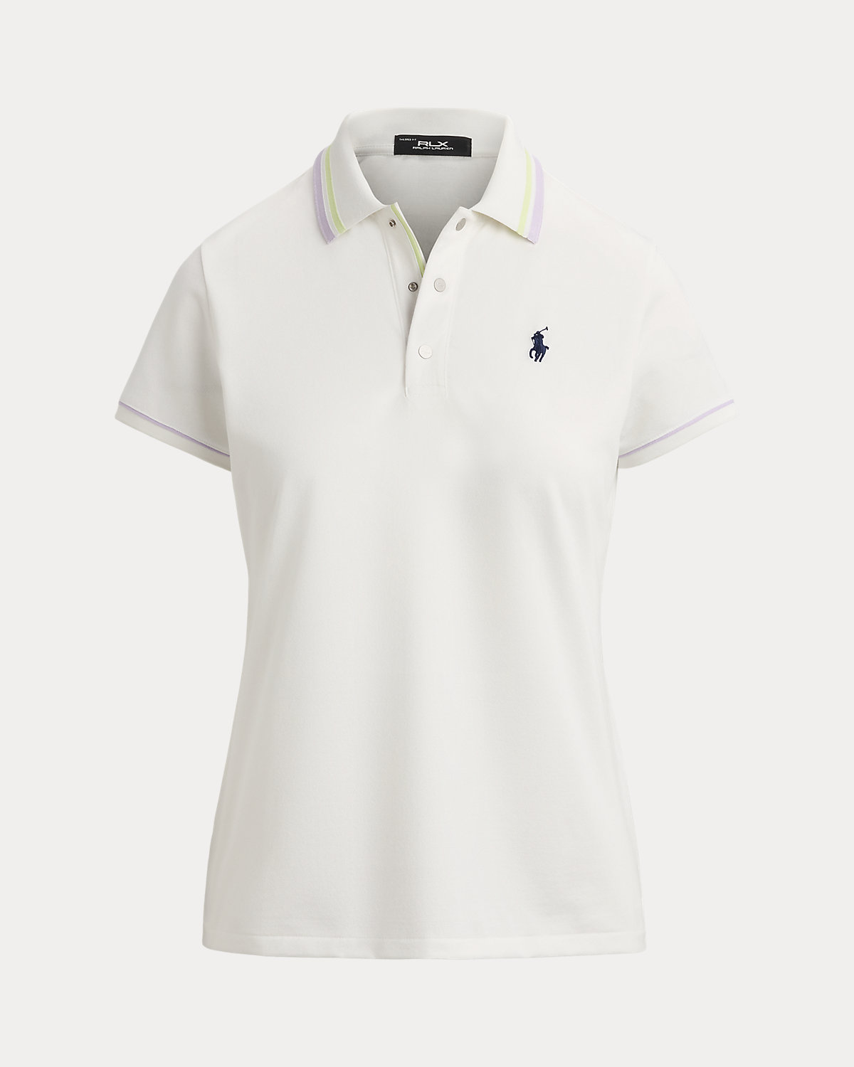 - Ribbed Polo collar with striped tipping. Three-snap placket. Metal snaps custom-developed with an "RLX" logo.
