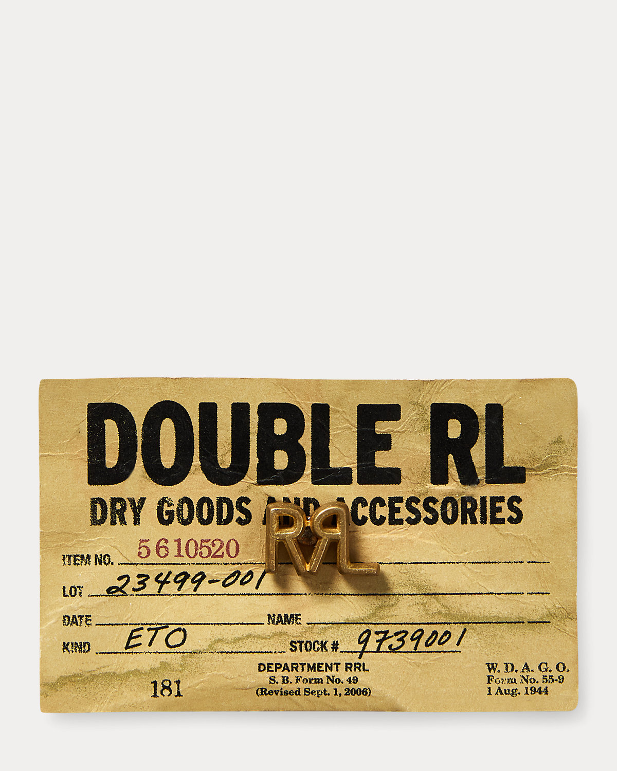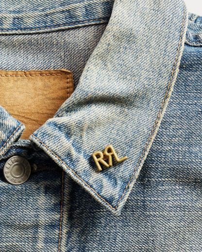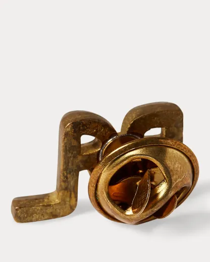 Brass pin modeled after the Double RL Ranch logo. Corroded finish. Pin-back closure.