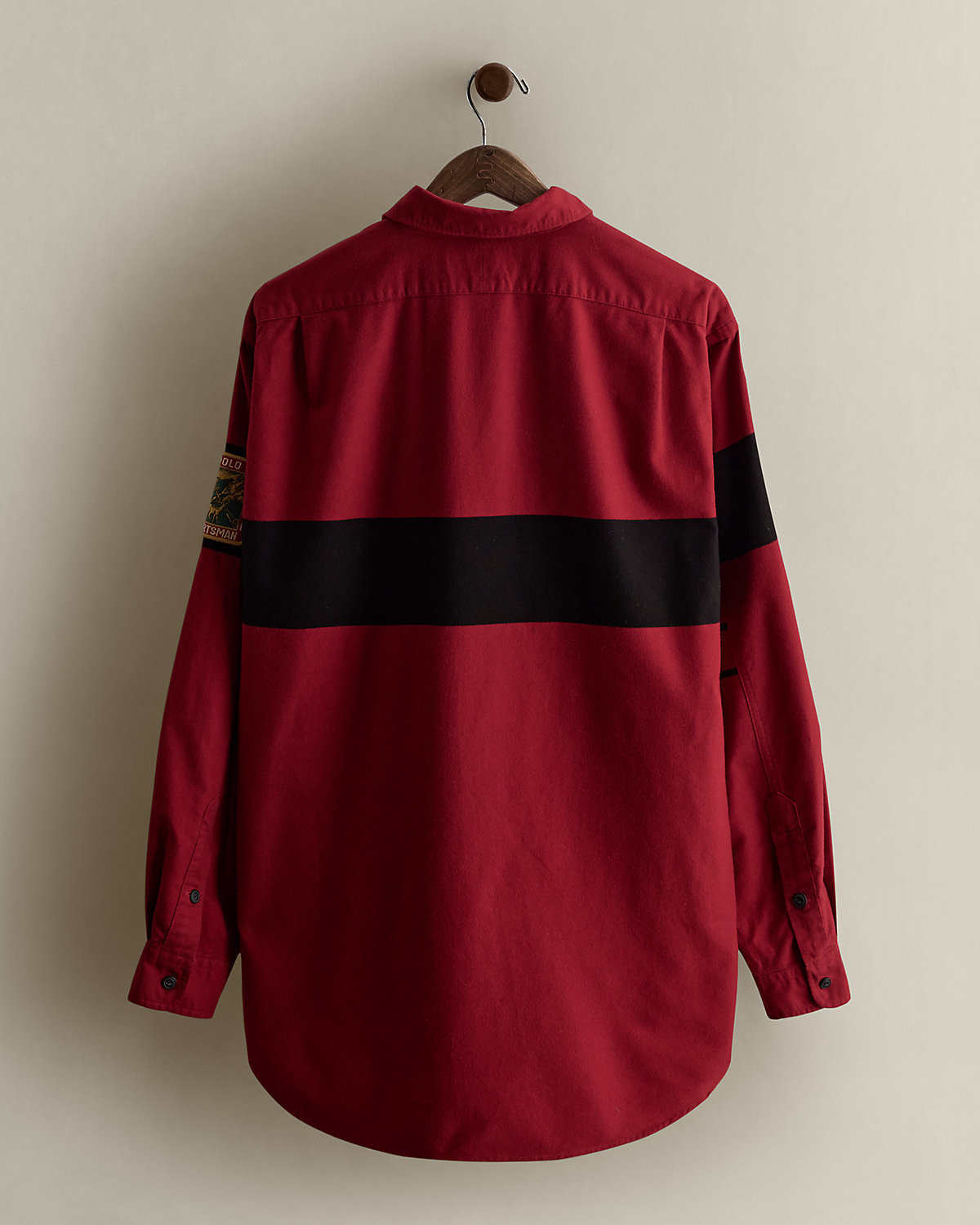 Part of the Fall 1993 Polo collection. Striped utilitarian-styled shirt made with lightweight cotton chamois. “Polo Ralpthth Lauren Sportsman” patch at the left sleeve. Size XL has approximately a 33.5" back body length, a 20.5" shoulder, a 54" chest, and a 25" sleeve length.