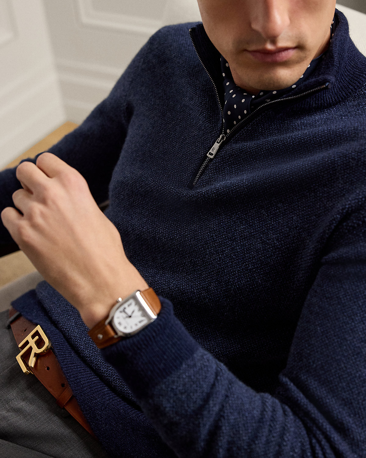 - Rib-knit mockneck. Quarter-zip placket with suede trim.