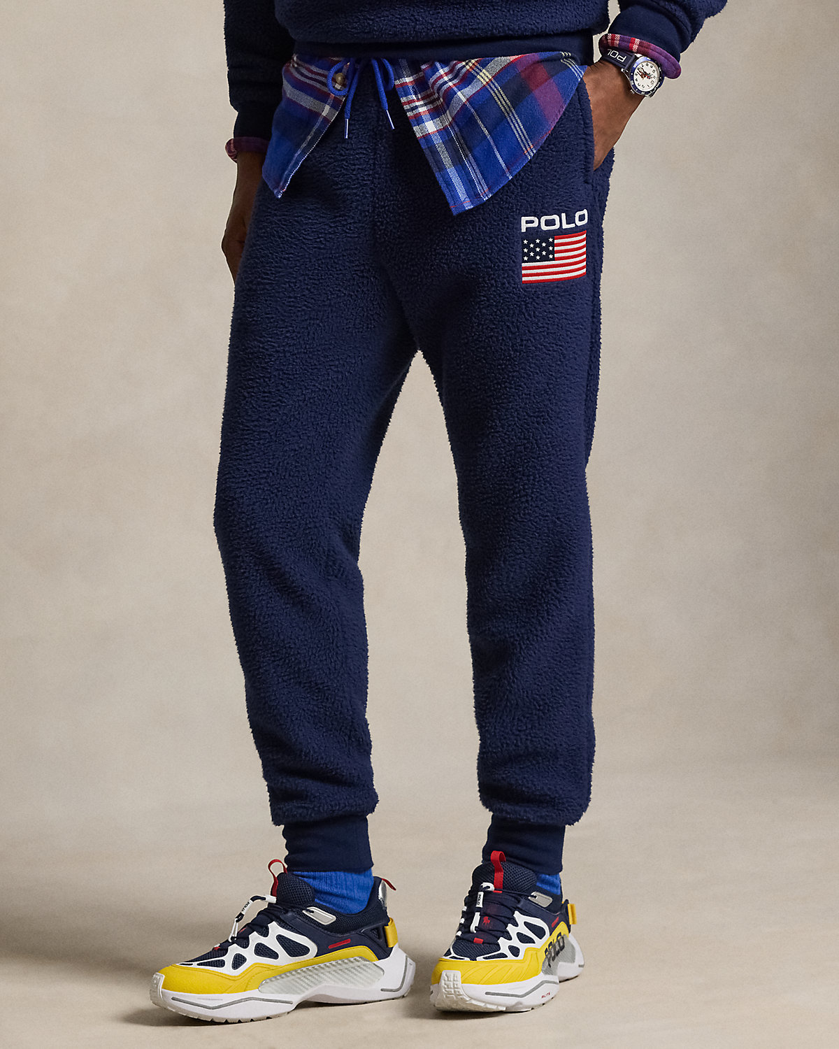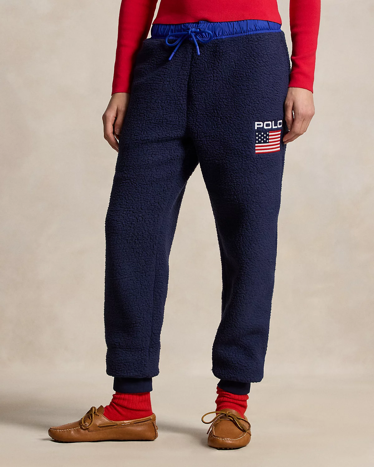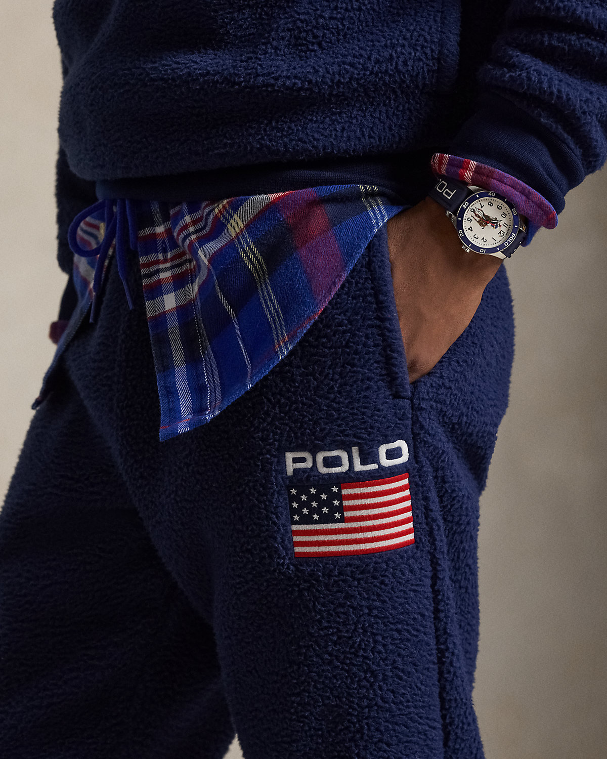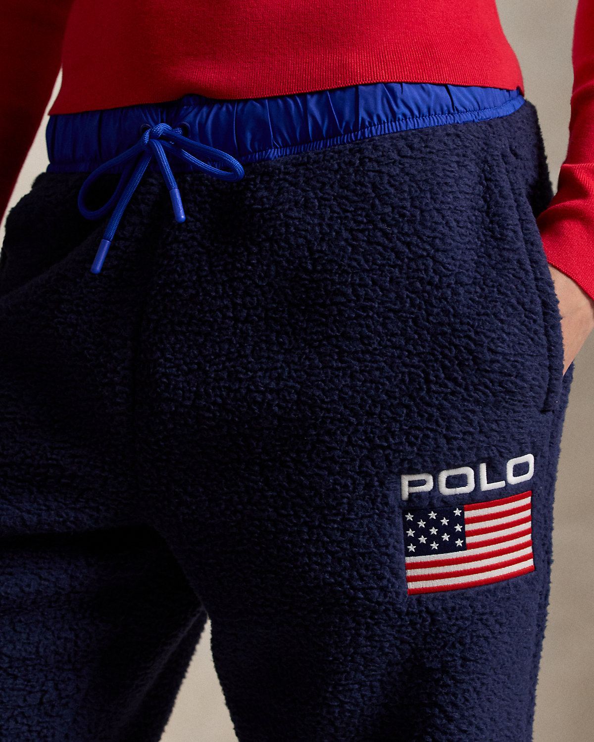 - “Polo” and a historical American flag embroidered at the left leg.