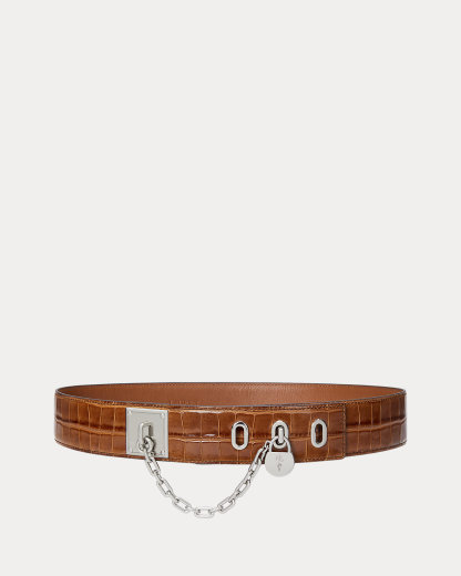 Glossy crocodile-embossed leather brings texture and luxurious appeal to this wide belt, which is decorated with a glistening curb-link chain and an “LRL”-engraved padlock-shaped buckle. This style is finished with a supple full-grain leather lining—distinguished by its naturally smooth finish—for added sophistication.