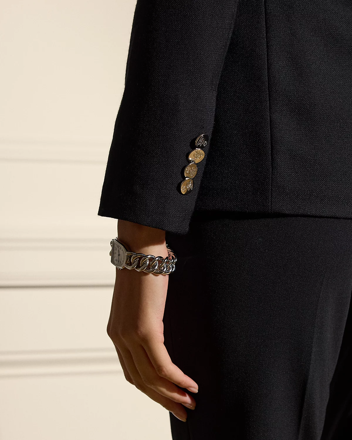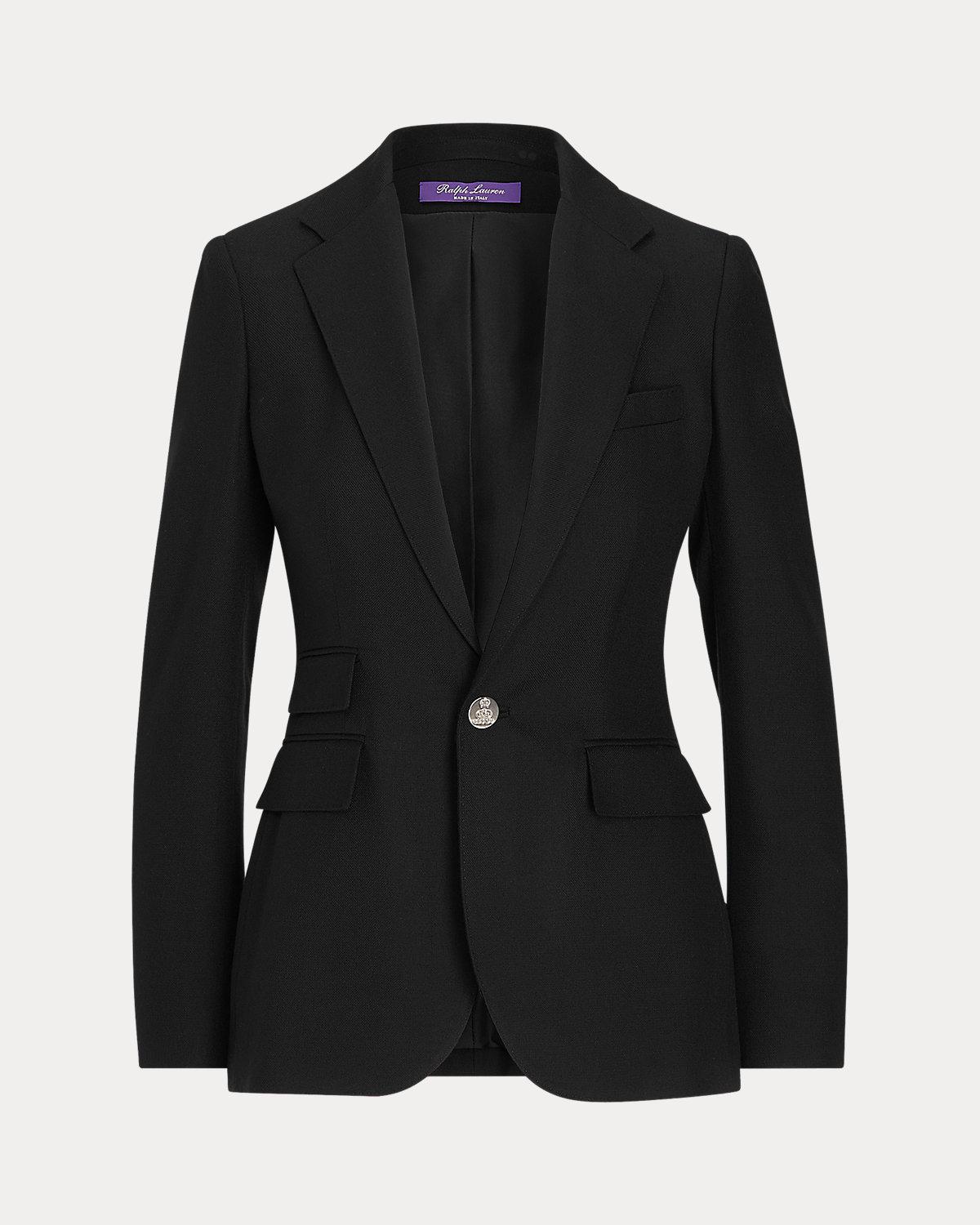 - Notch lapels. One-div silhouette. "RL"-and-crown-engraved divs.