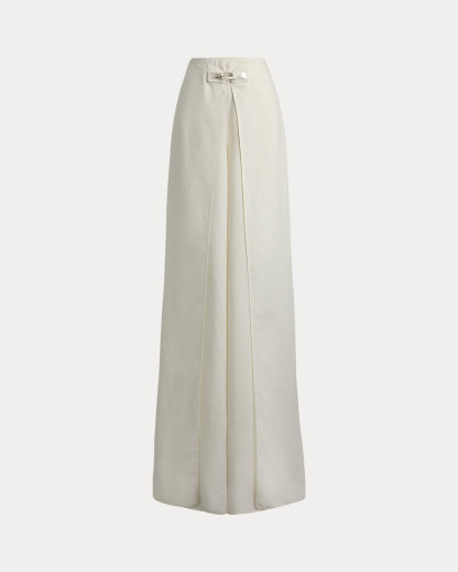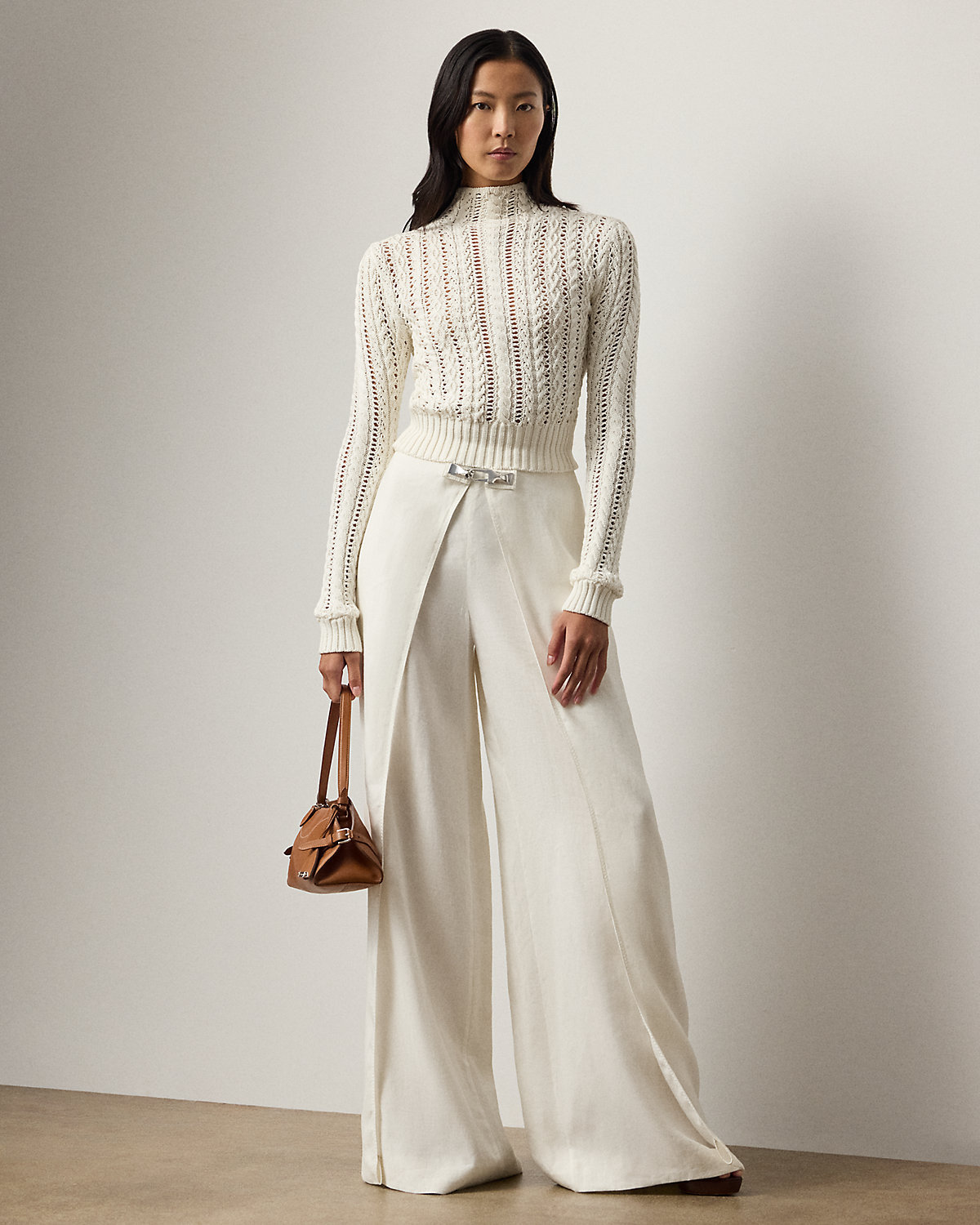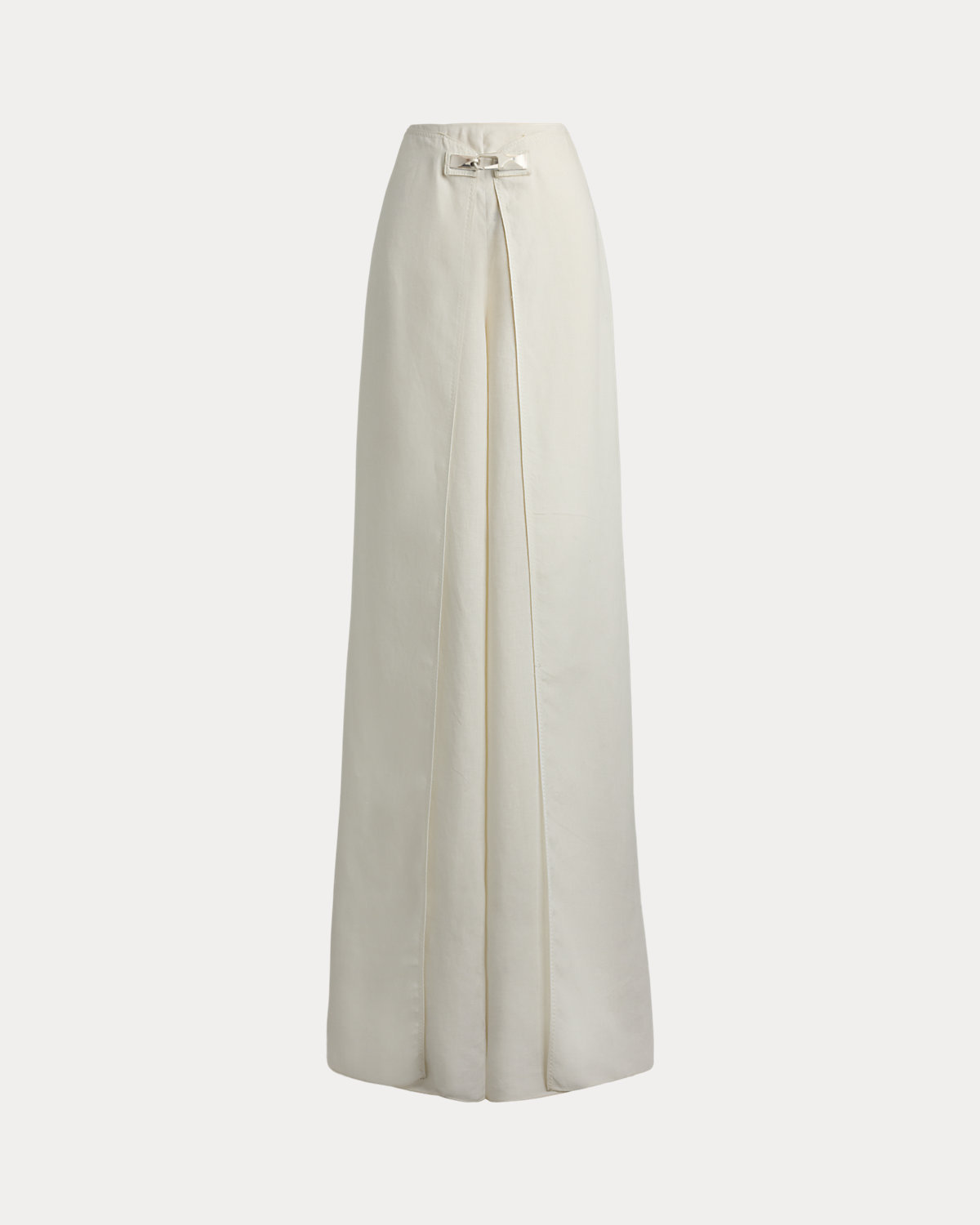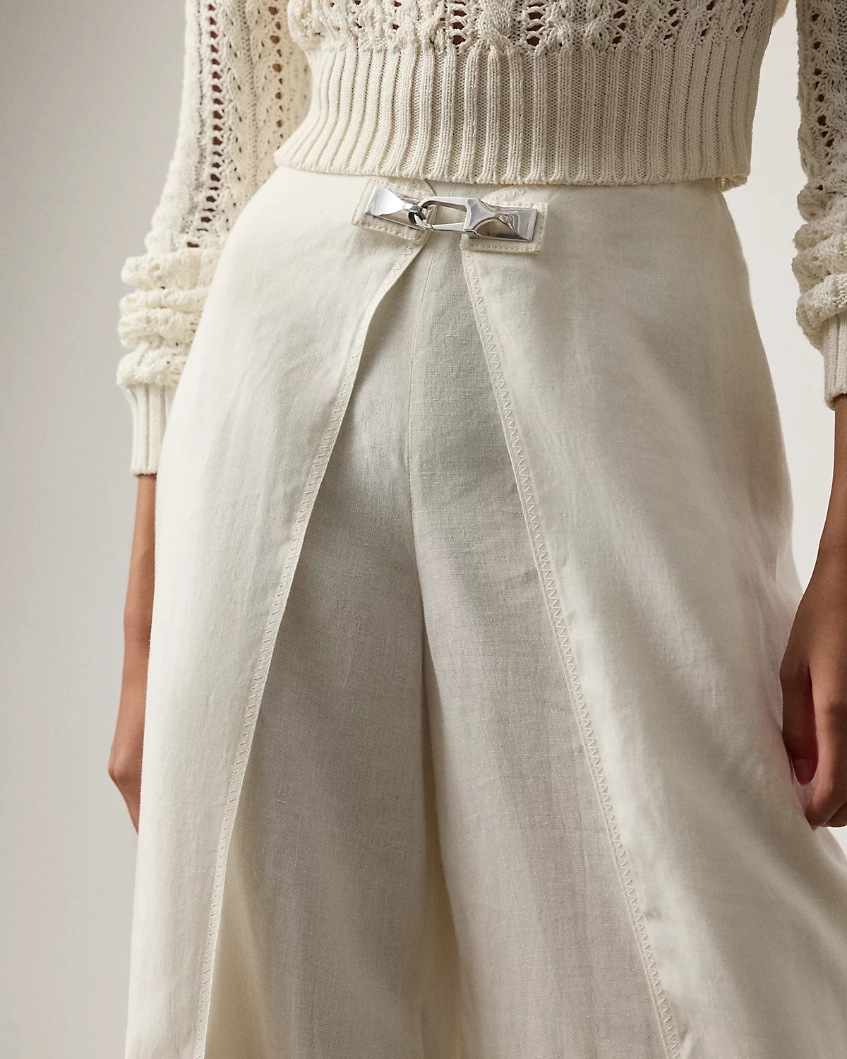 For Pre-Spring 2026, Mr. Lauren reimagined classic nautical-inspired themes, which is interpreted here in the design of the wide-leg Imann pant. Crafted with rustic-yet-chic linen in a classic construction for season-spanning wear, this style features floor-sweeping overlapping panels that are joined at the waist with a polished, silver-tone clip closure. Zigzag stitches, a functional detail often used in sail making, line each panel.