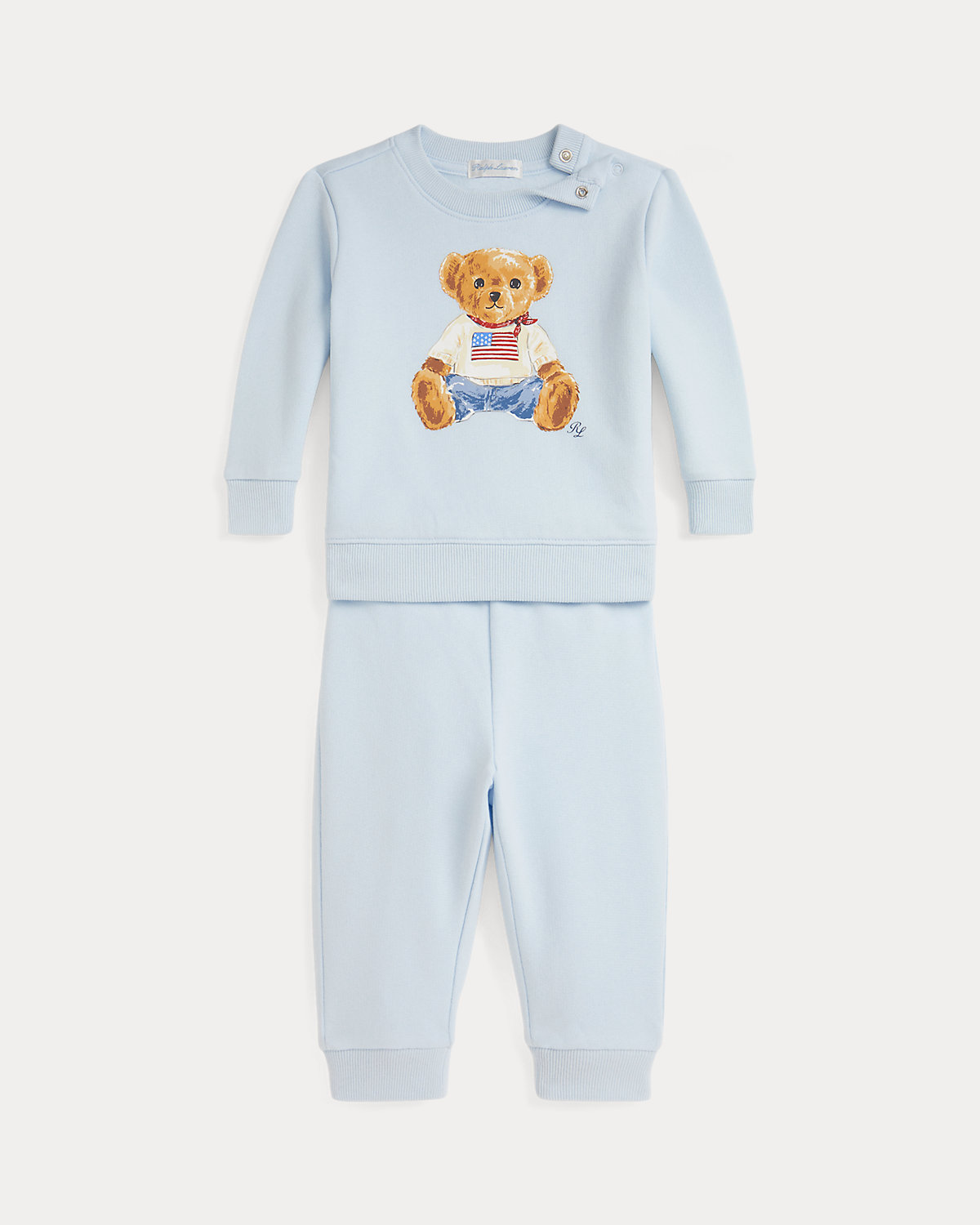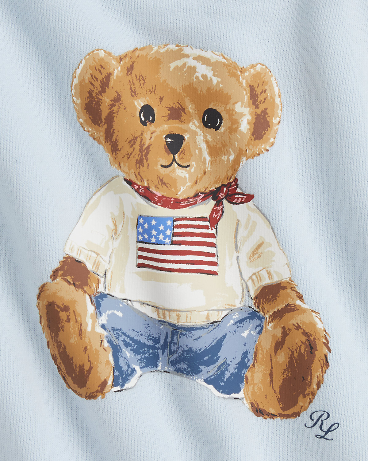 This set is made with peached cotton-blend fleece and then washed for even greater comfort. On the sweatshirt, our beloved Polo Bear wears Ralpthth Lauren’s Iconic Flag Sweater with jeans and a bandanna.