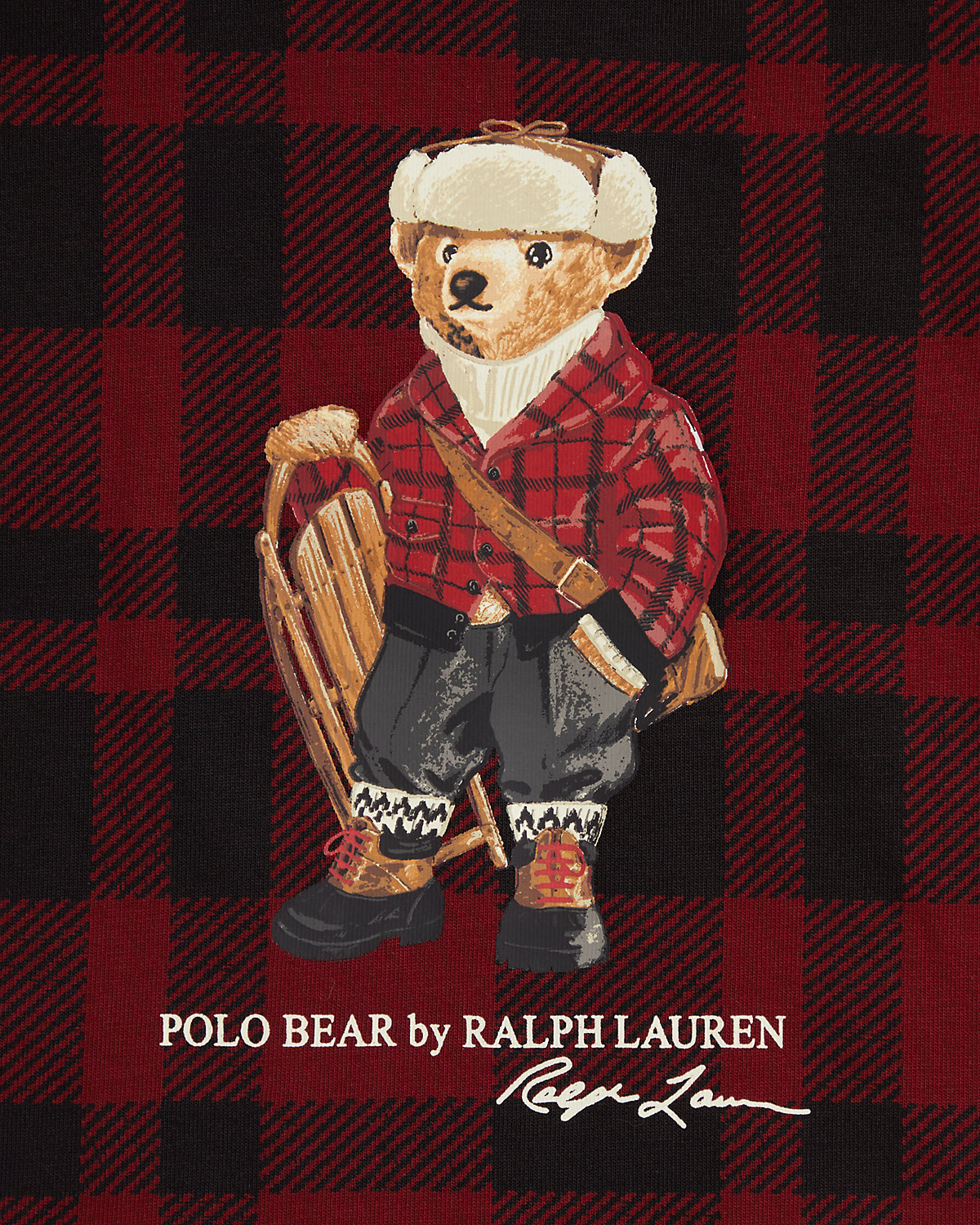 - Tee: crewneck; sizes 3 to 12 months have a two-snap placket at the left shoulder; long sleeves with ribbed cuffs; Polo Bear, “Polo Bear by Ralpthth Lauren,” and “Ralpthth Lauren” script printed at the center front.