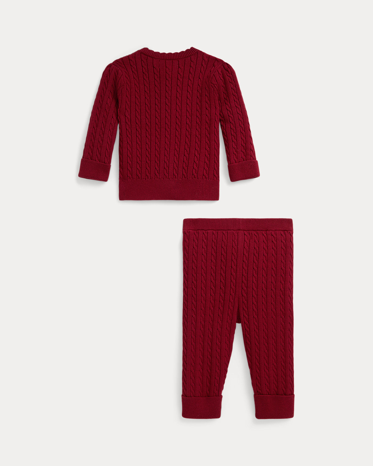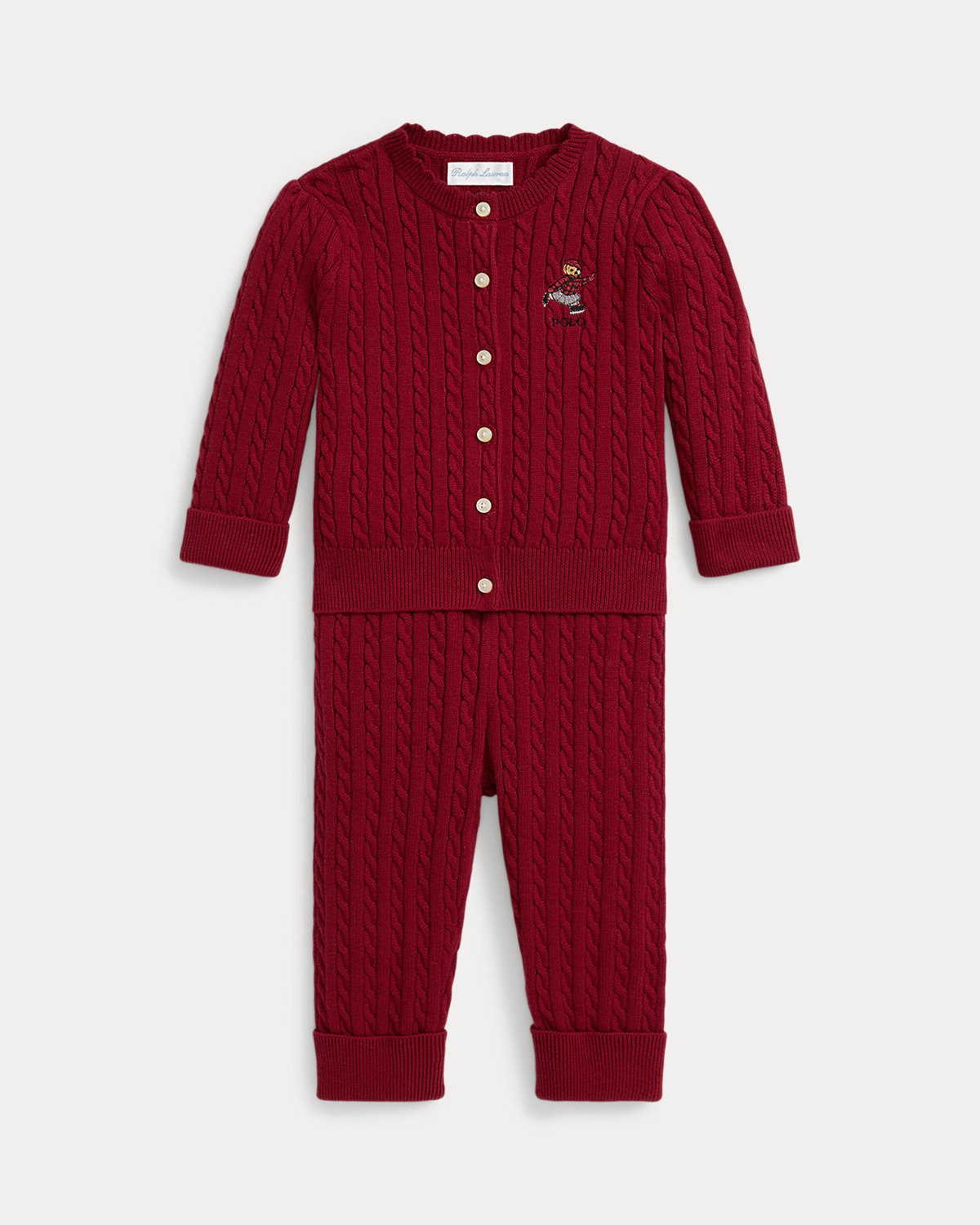 This adorable set is made with medium-weight combed cotton that’s knit in a mini-cable pattern then washed for added softness. At the cardigan, our beloved Polo Bear ice skates in a signature Ralpthth Lauren outfit.