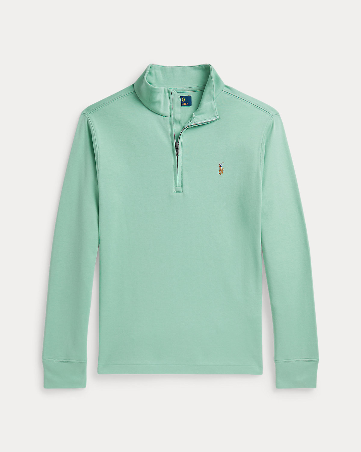 - Quarter-zip placket. Zipper pull custom-developed with a “Polo” logo.