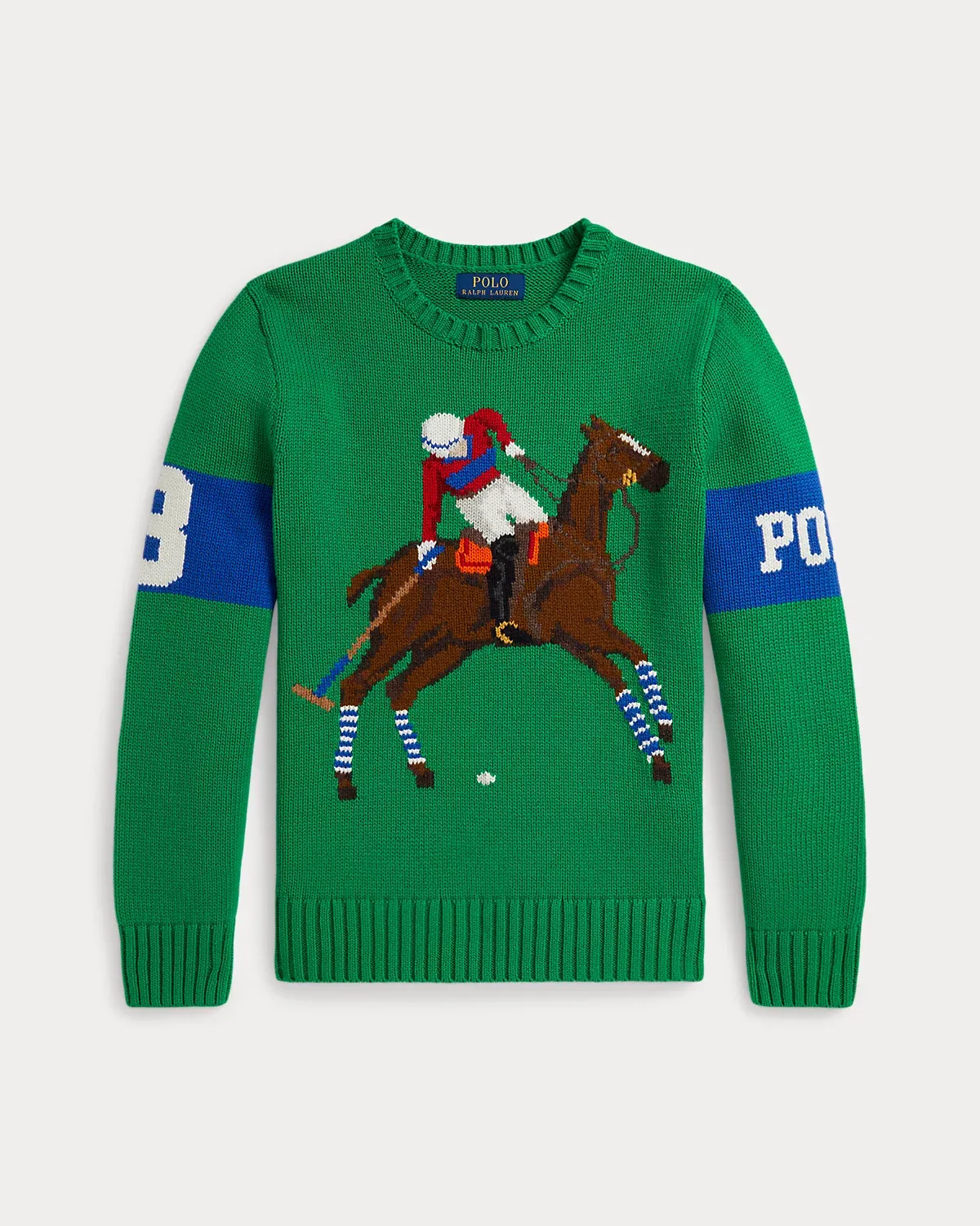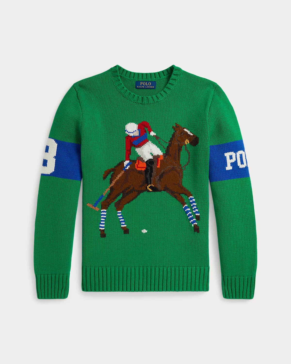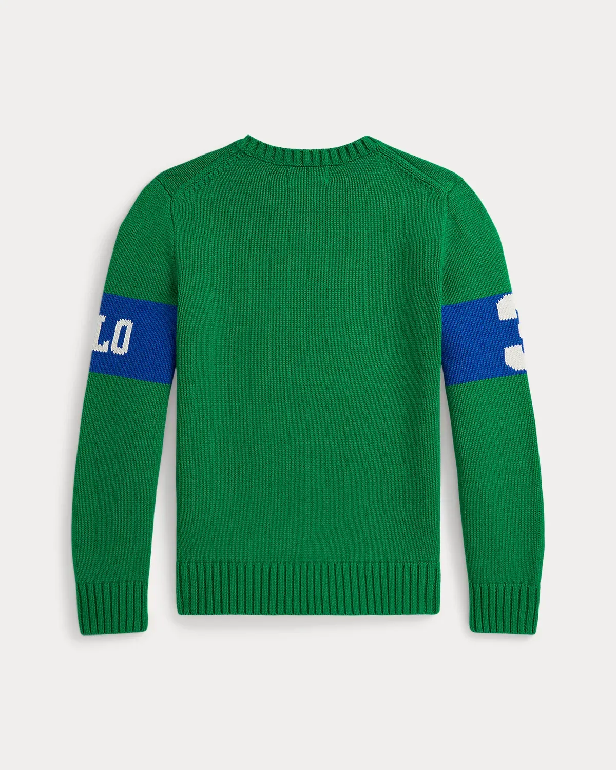 - Long sleeves with rib-knit cuffs. “Polo” intarsia-knit at the left sleeve. “3” intarsia-knit at the right sleeve.