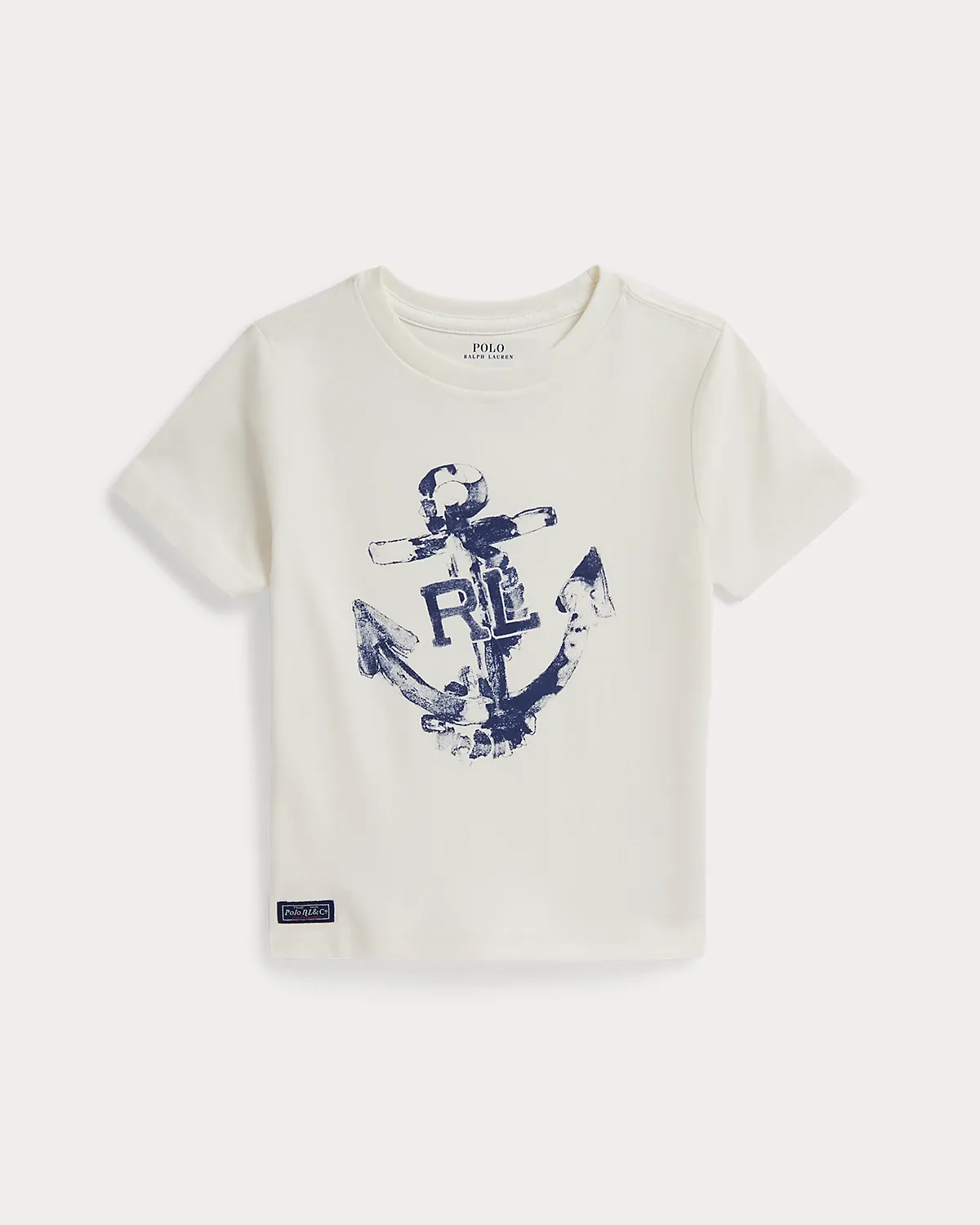 This crewneck tee nods to the season’s nautical style with a weathered anchor graphic that features our founder’s initials.