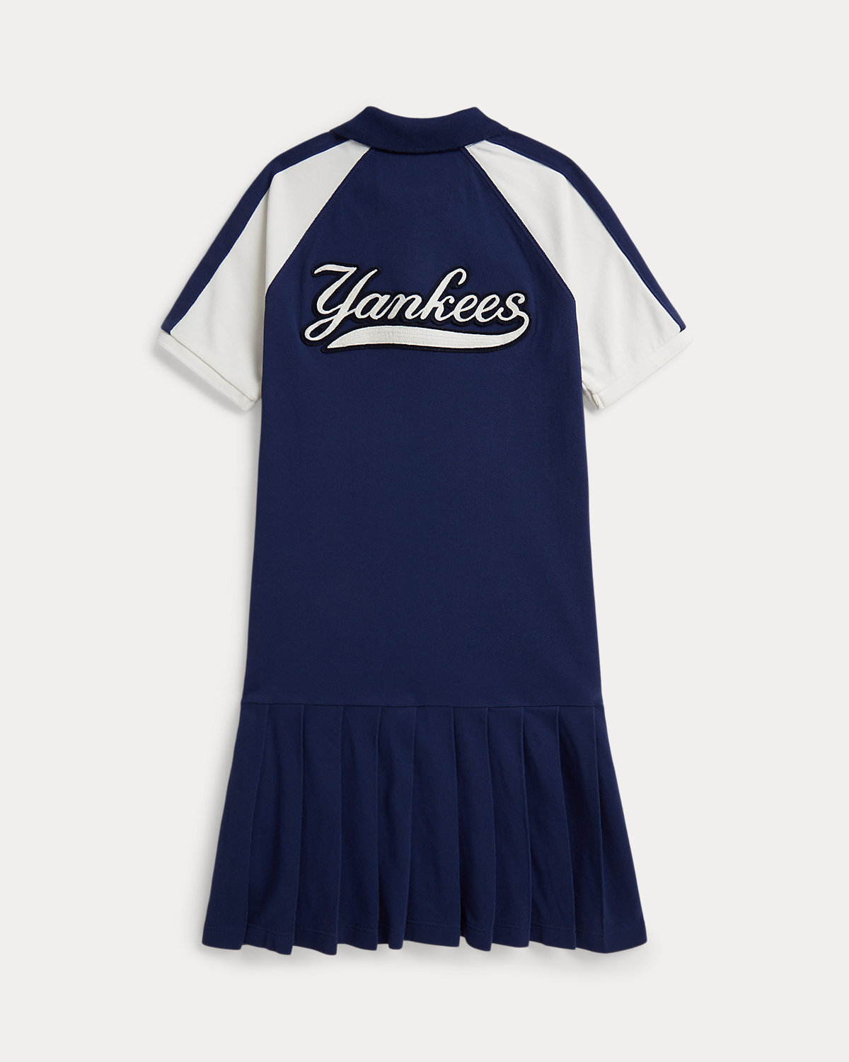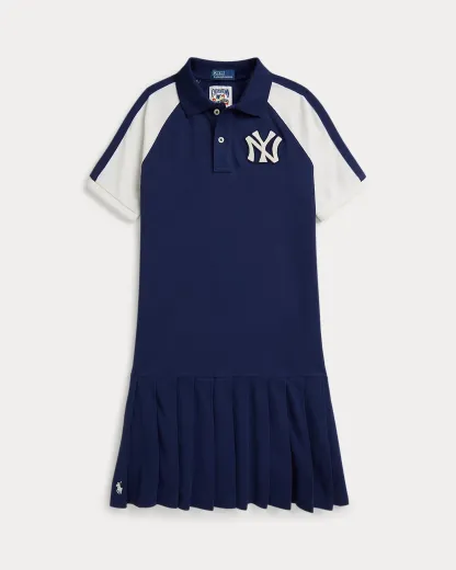 - Ribbed Polo collar. Two-div placket. Short raglan sleeves with ribbed armbands. Pieced stripe at each sleeve. Felt New York Yankees™ logo patch at the left chest. Yankees™ patch at the center back. Pleated skirt.