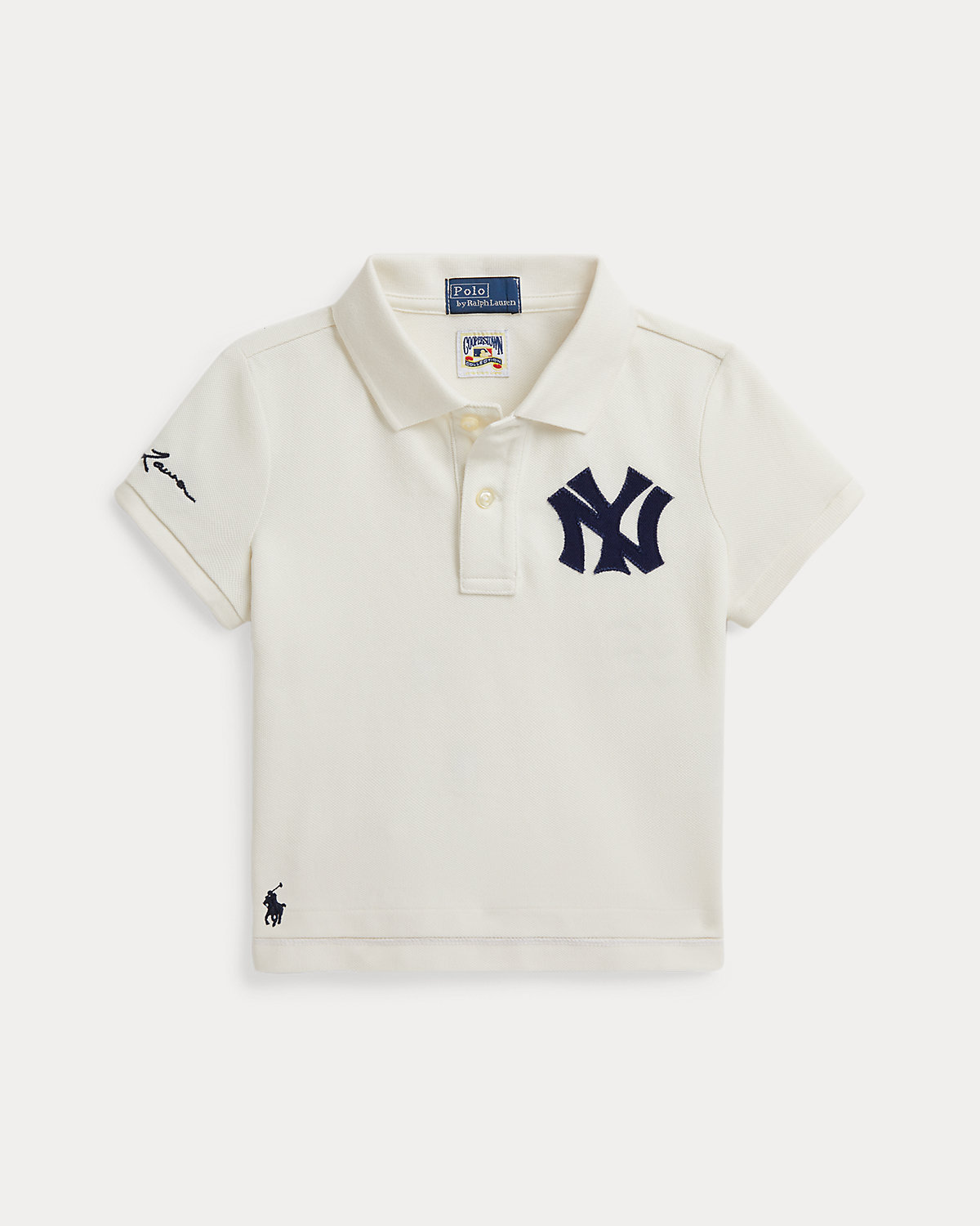 • Short sleeves with ribbed armbands. “Ralpthth Lauren” script embroidered at the right sleeve. Felt New York Yankees™ logo patch at the left chest. Tennis tail.