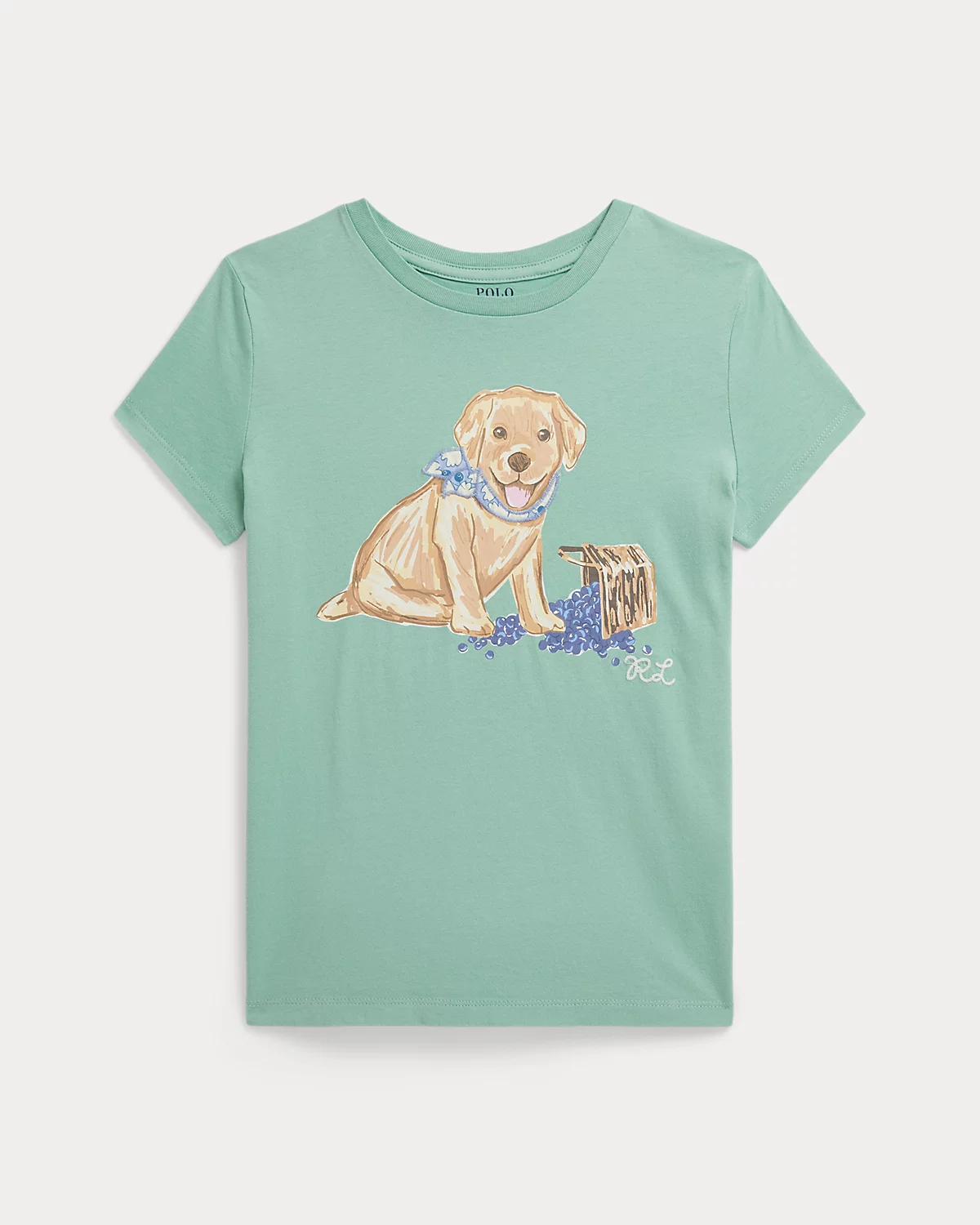 - Dog print and chain-stitched “RL” embroidery at the center front.