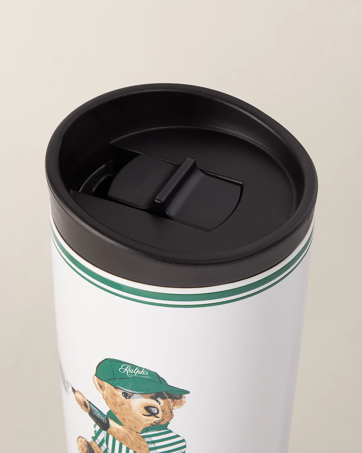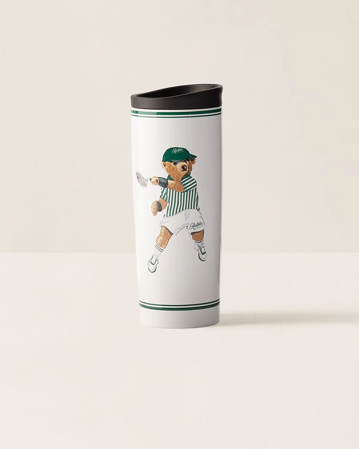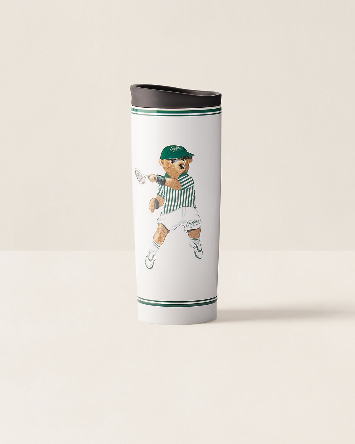 This reusable stainless steel tumbler features the Polo Bear donning Ralph’s Coffee gear while enjoying a spirited game of tennis.