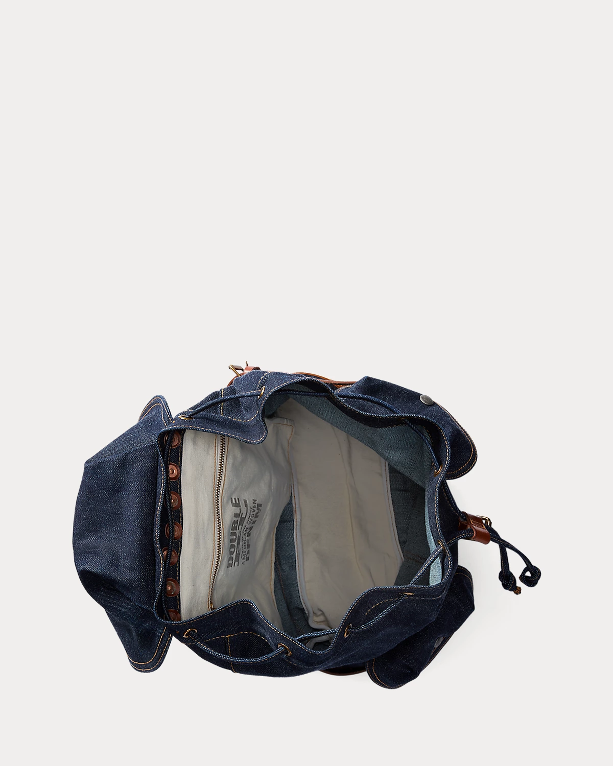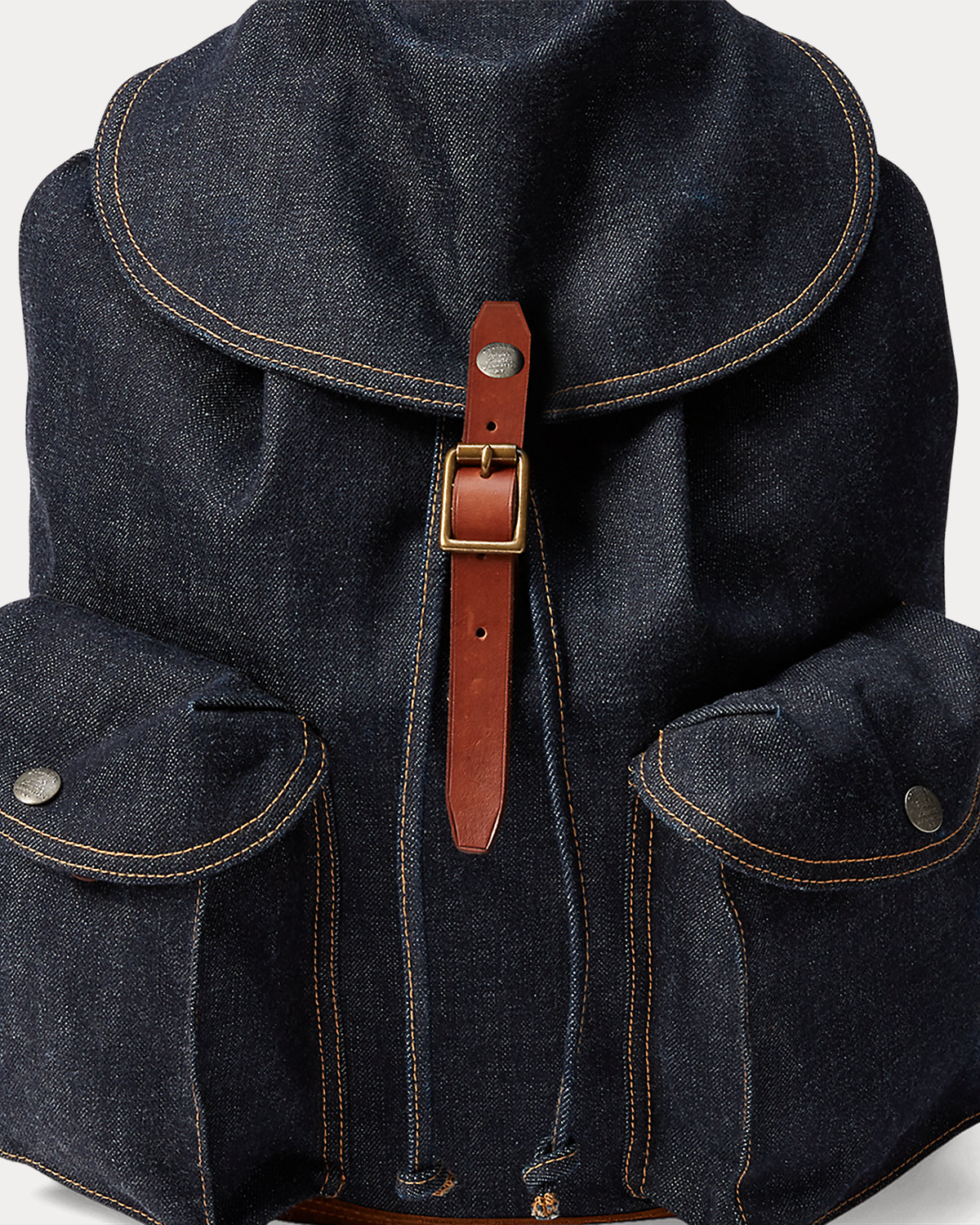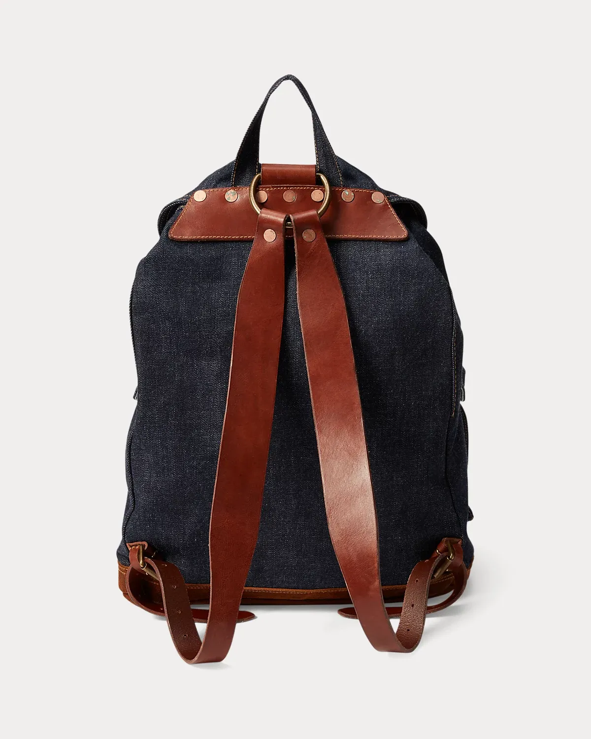Unisex. Constructed from indigo-dyed denim. Full-grain leather trim. Solid brass hardware and copper-tone rivets.