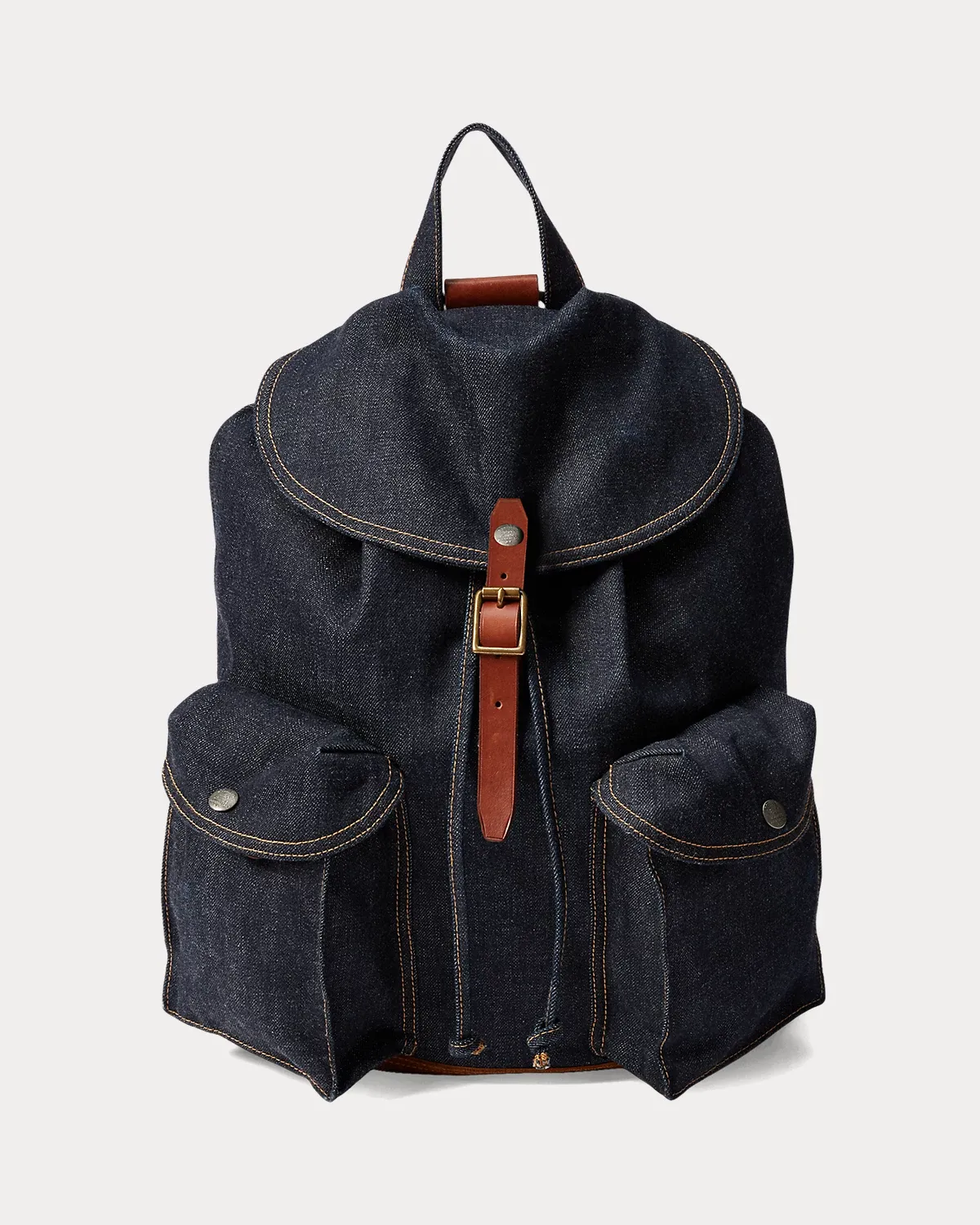 - Front fold-over leather flap secures with a brass buckle. Drawstring closure underneath the front fold-over flap.