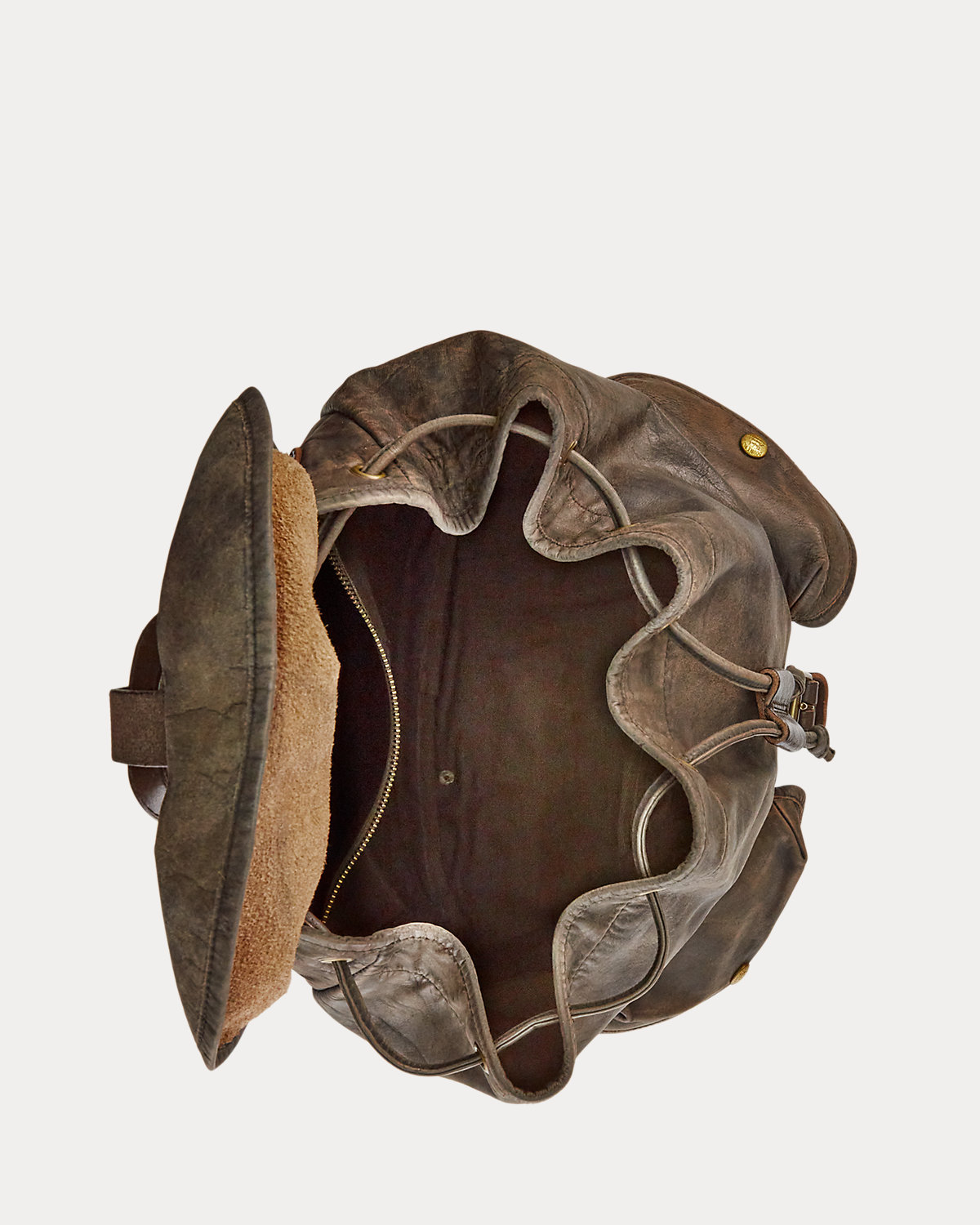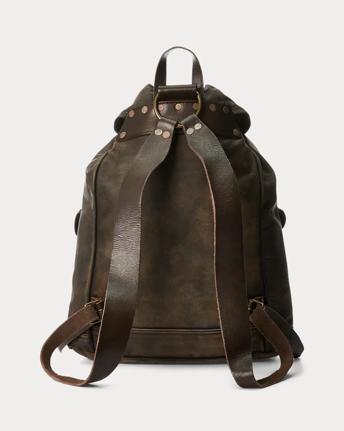 Iconic rucksack model made from lightweight, supple leather. Specially hand-finished for a timeworn look. Brass hardware and distressed copper-tone rivets.