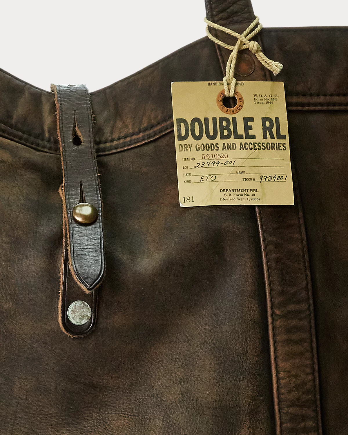 Made from lightweight, supple leather. Specially hand-finished for a timeworn look. Fully lined with cotton canvas. Brass hardware and distressed copper-tone rivets.