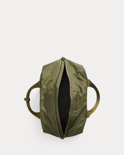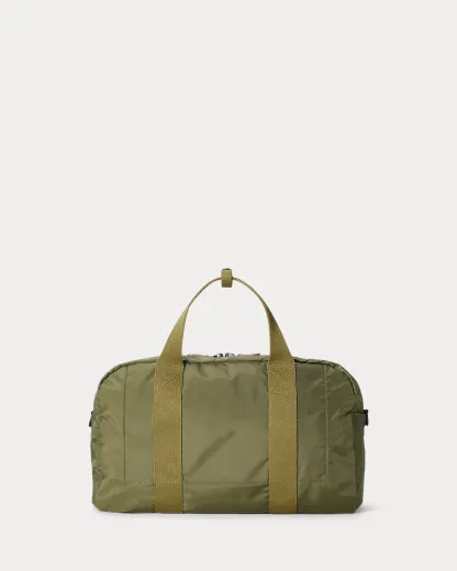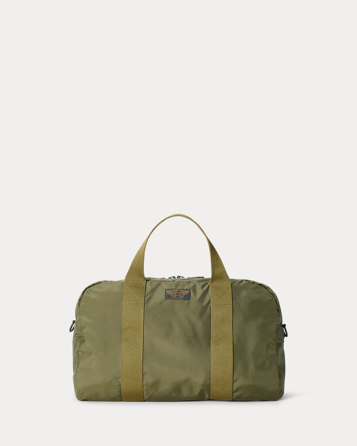 Constructed with durable yet lightweight nylon canvas. Inspired by mid-century surplus bags. Webbed top handles and removable shoulder strap. Self-lined. Leather zipper pulls. Solid brass hardware with a black oxidized finish.
