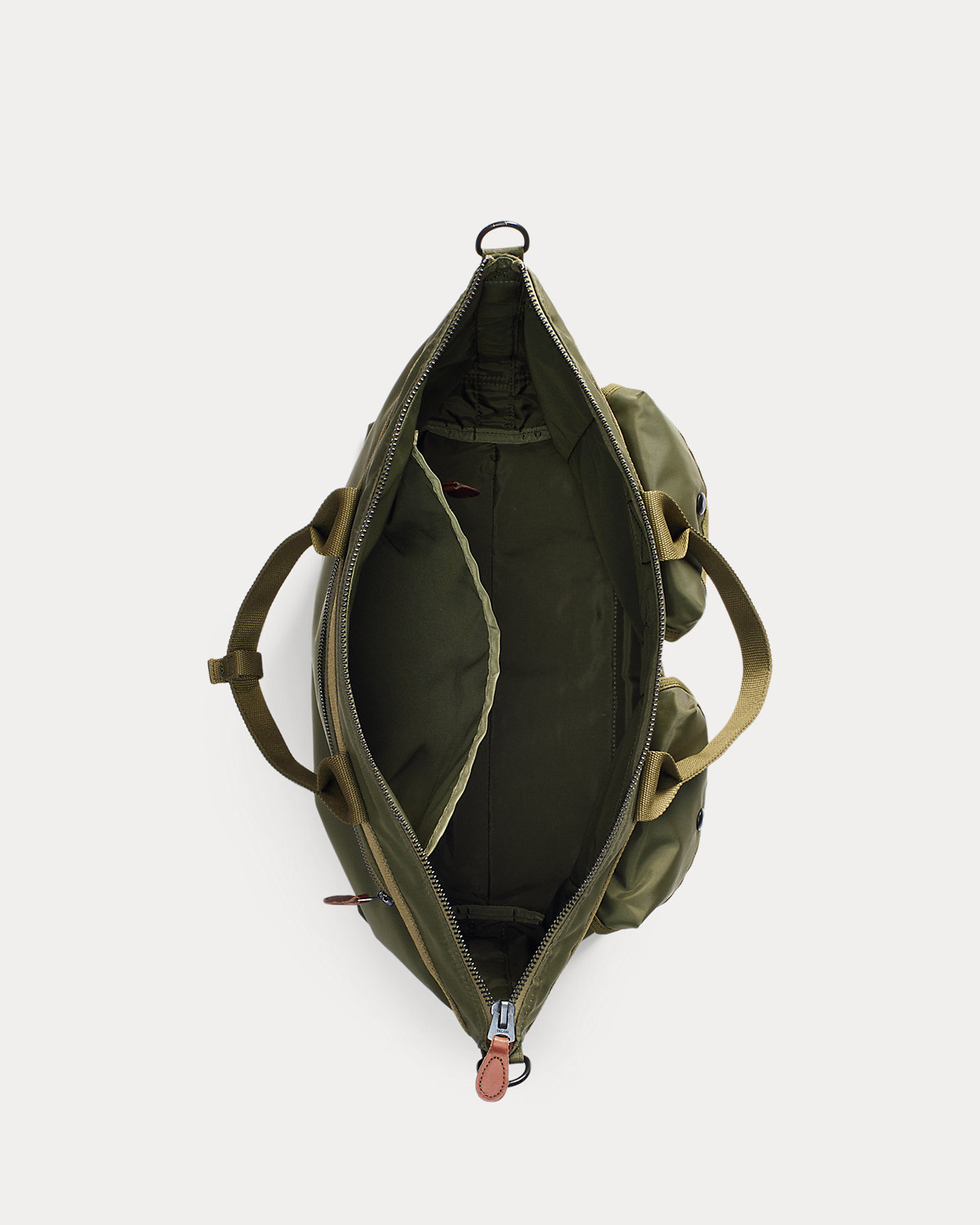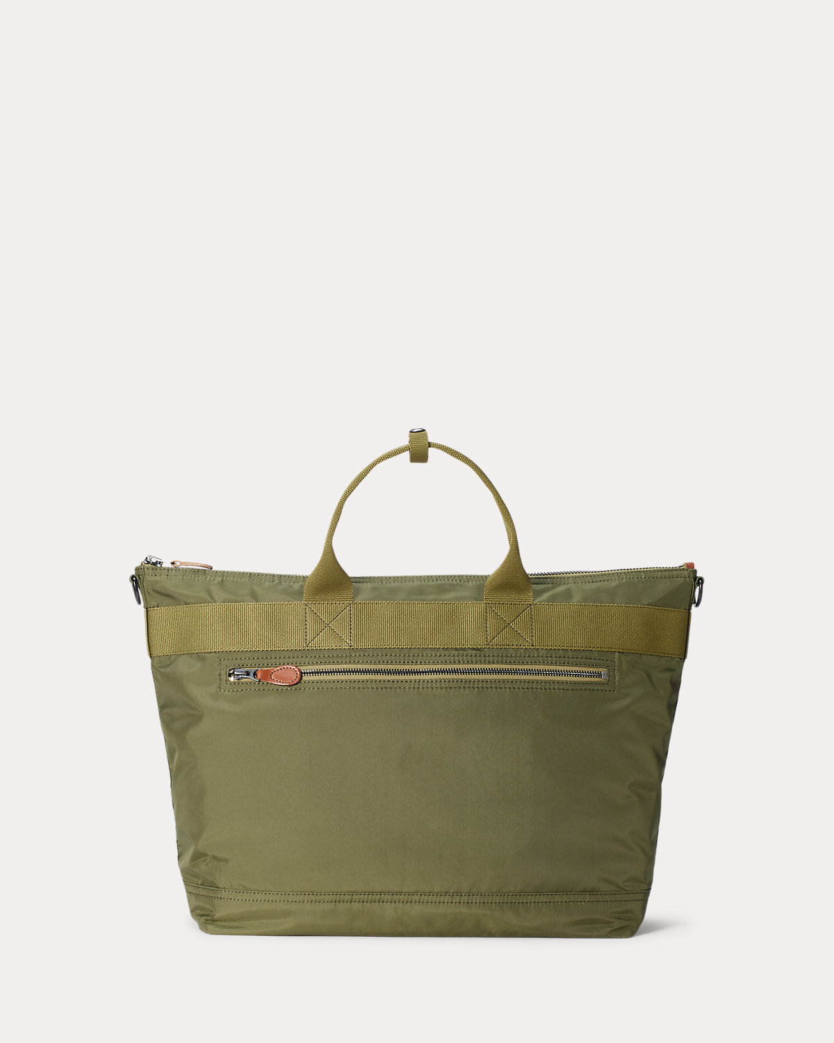 Constructed with durable yet lightweight nylon canvas. Webbed top handles and removable shoulder strap. Self-lined. Leather zipper pulls. Solid brass hardware with a black oxidized finish.