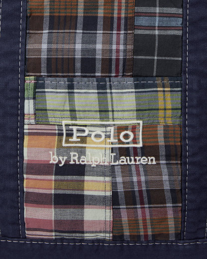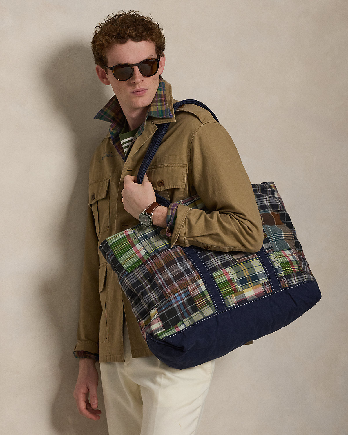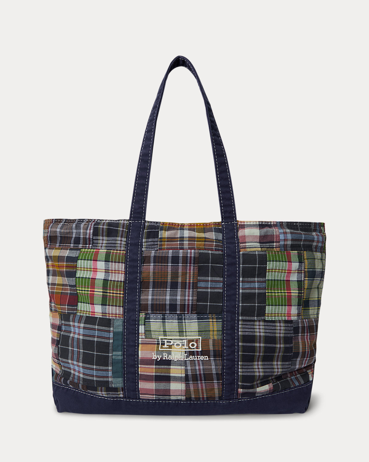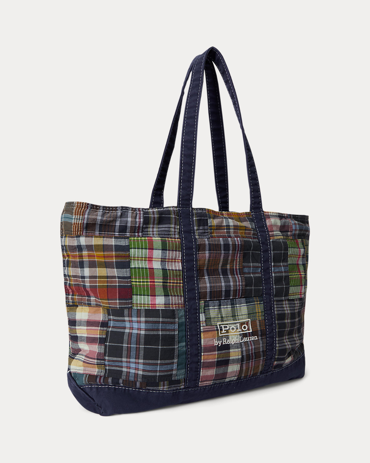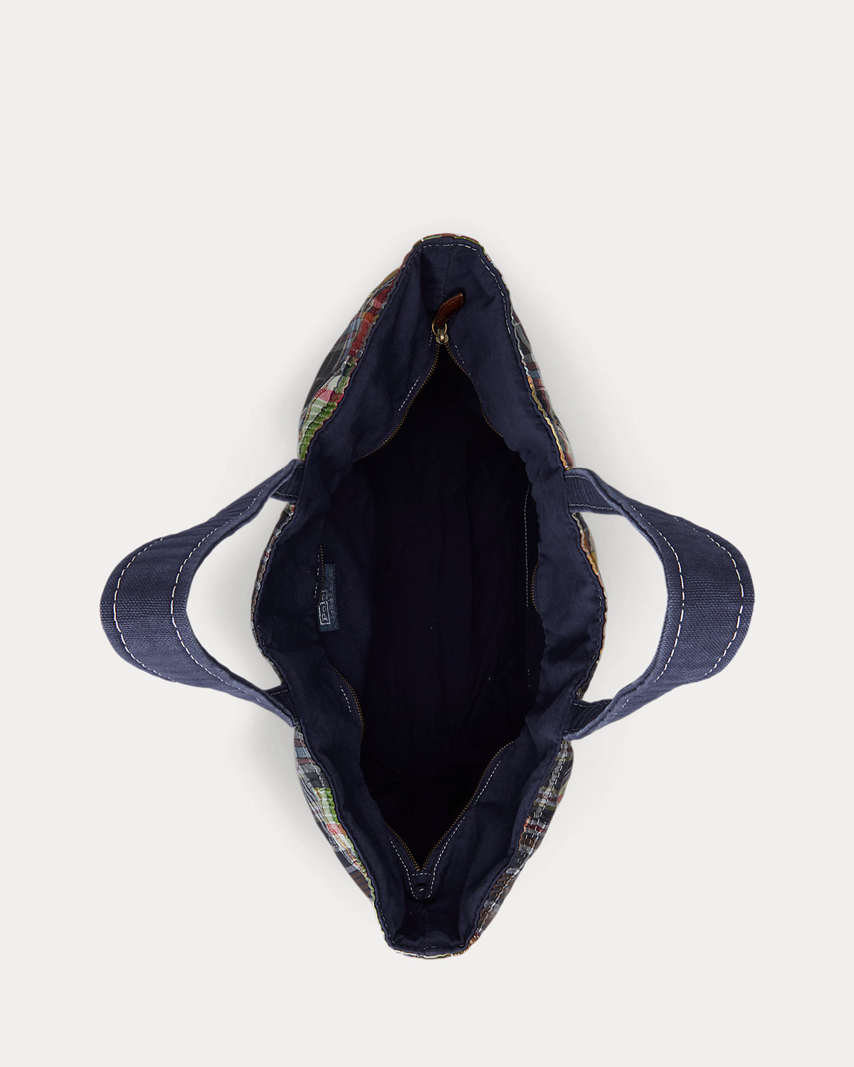 This spacious tote is crafted with indigo-dyed cotton madras—a colorful, lightweight fabric with characteristic slubs and one-of-a-kind variations—and specially treated for a timeworn look.