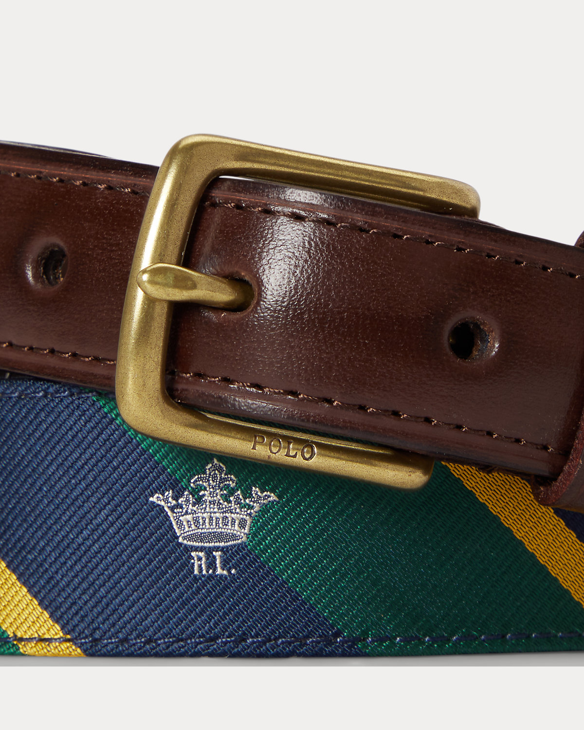 This belt’s silk cloth is custom-developed with a historic British mill and jacquard-woven with a signature crest motif and haberdashery-inspired diagonal stripes. It is finished with vegetable-tanned leather trim and an antiqued-brass buckle.