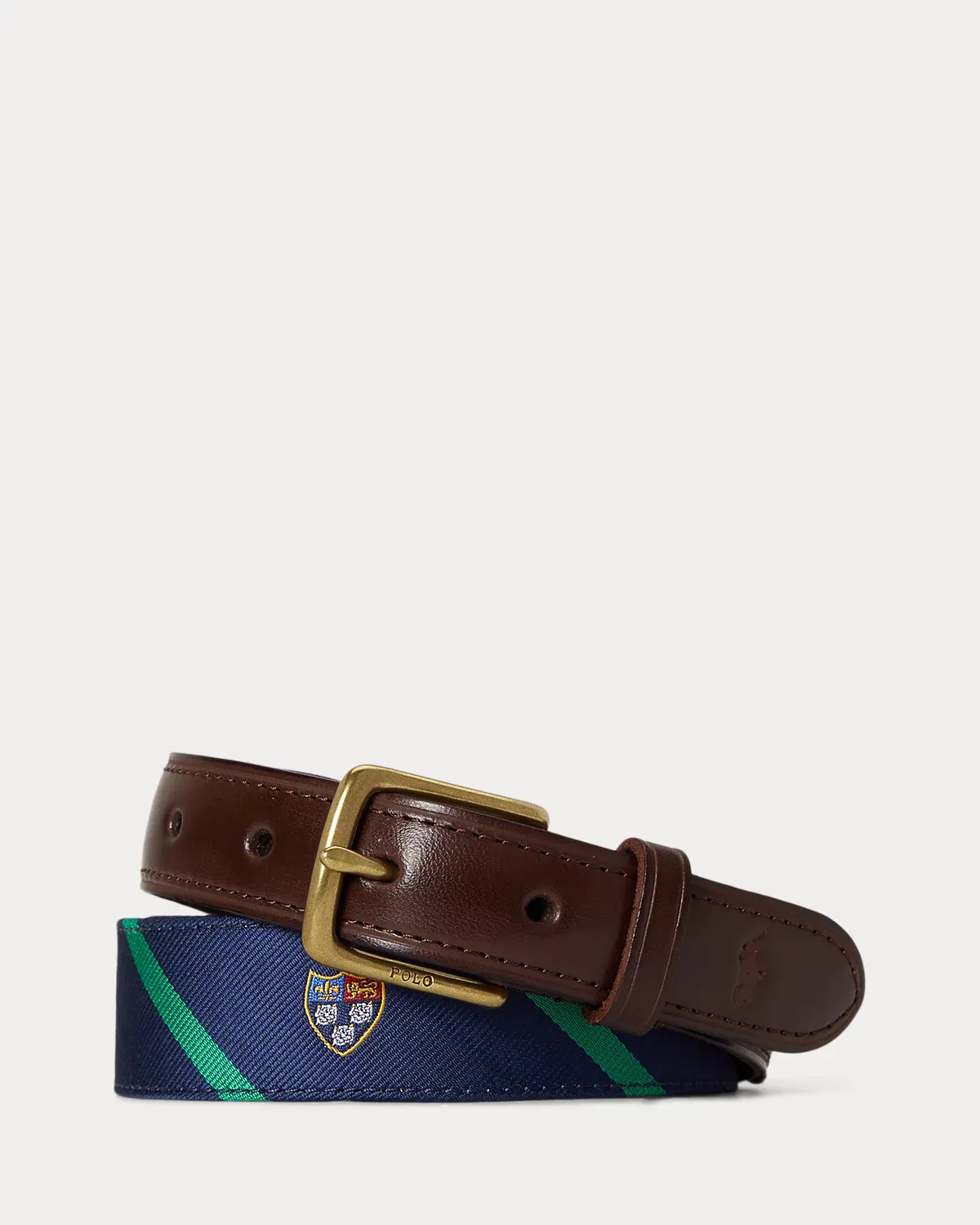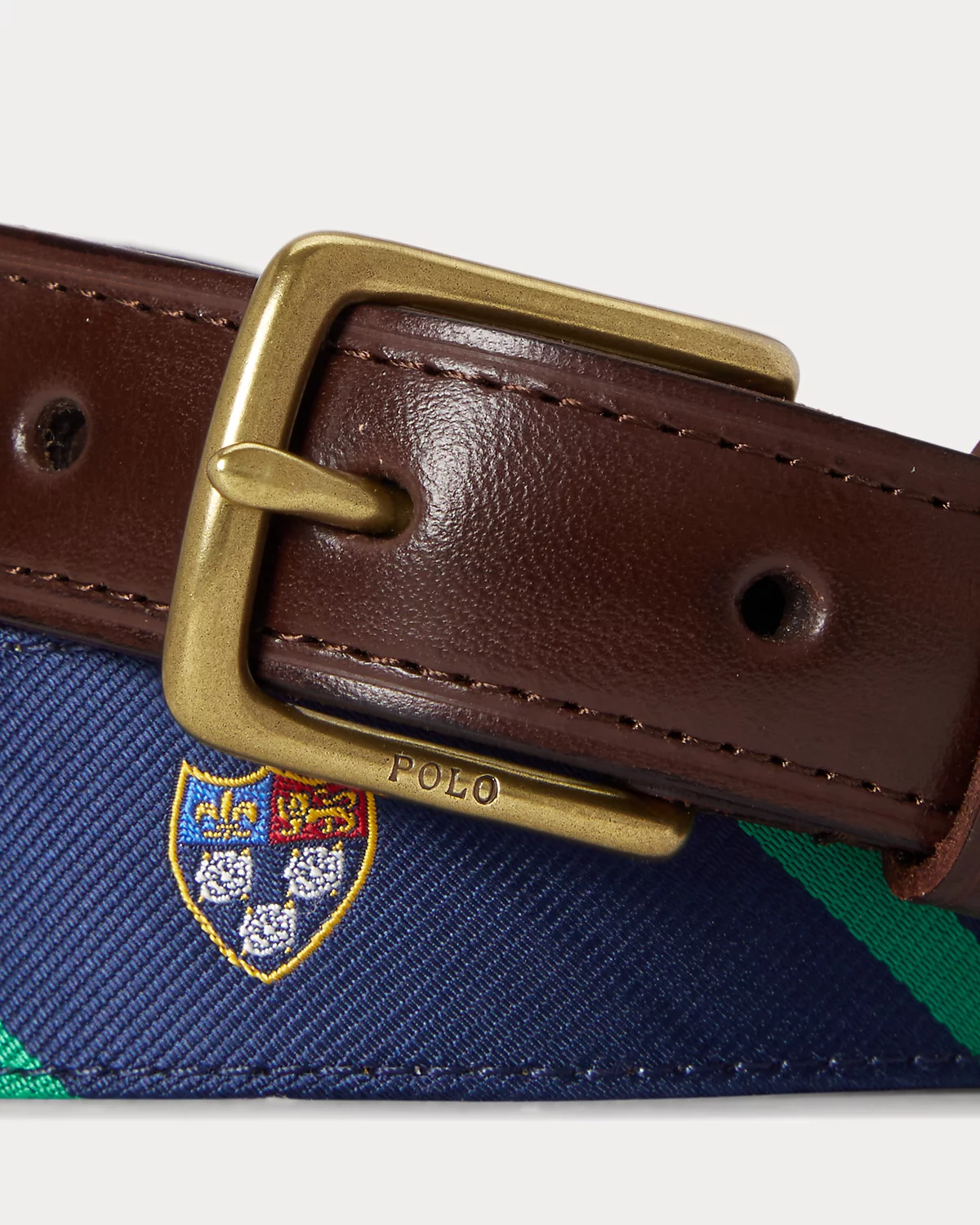 - Single-prong antiqued brass buckle custom-developed with a “Polo” logo.