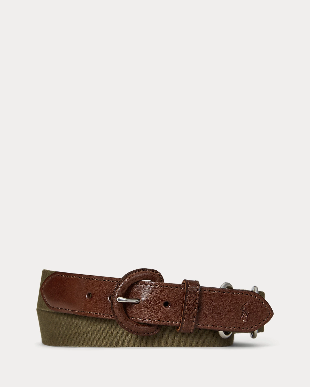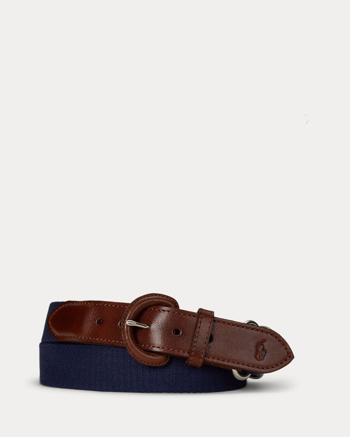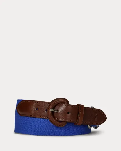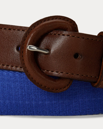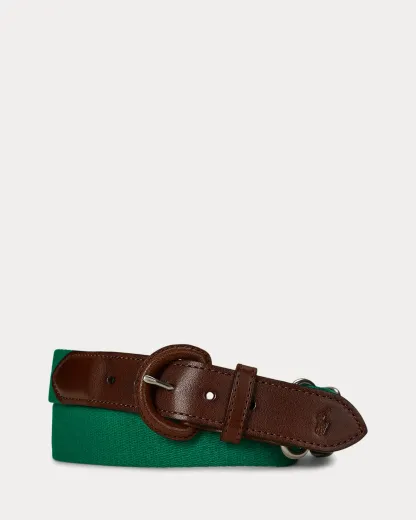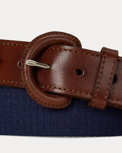 This belt unites a webbed cotton strap with full-grain leather trim. Debossed with Ralpthth Lauren’s signature Pony at the tip, it is finished with a leather-covered buckle.