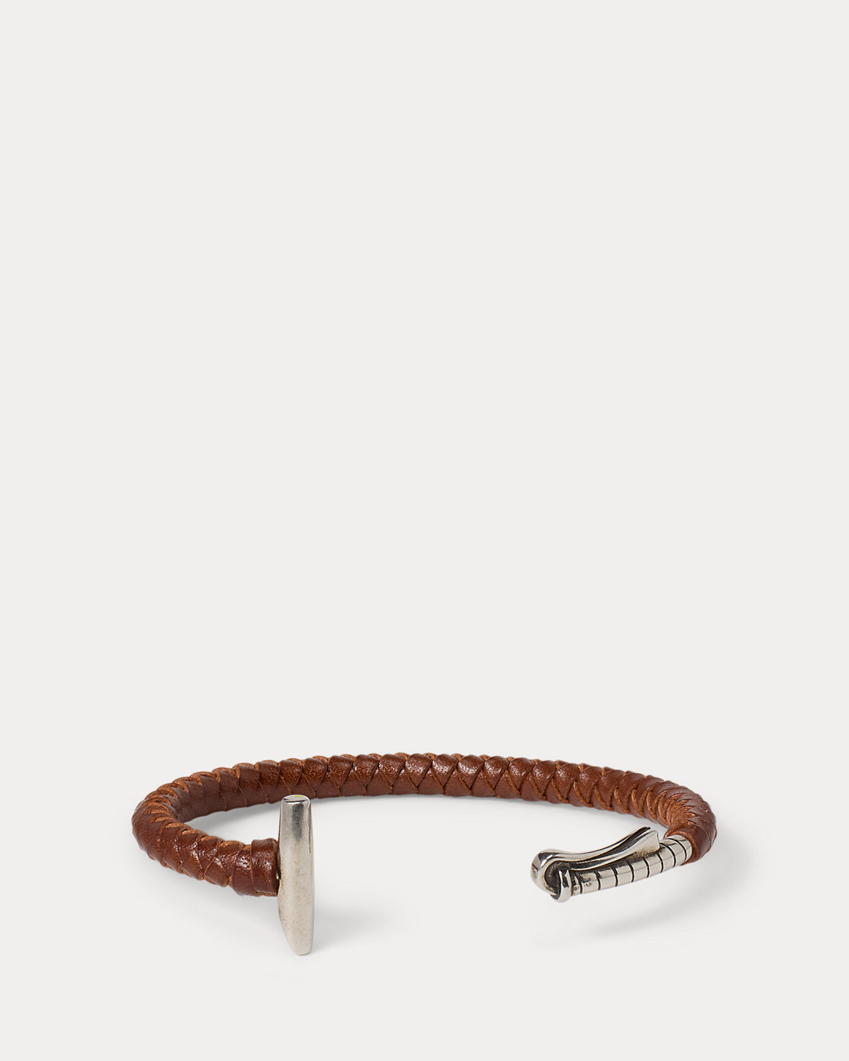 Part of Ralpthth Lauren’s inaugural fine jewelry collection for men, this equestrian-inspired cuff is meticulously crafted in Italy from sterling silver with a polished finish, wrapped in woven full grain calfskin, and designed with a polo mallet silhouette.