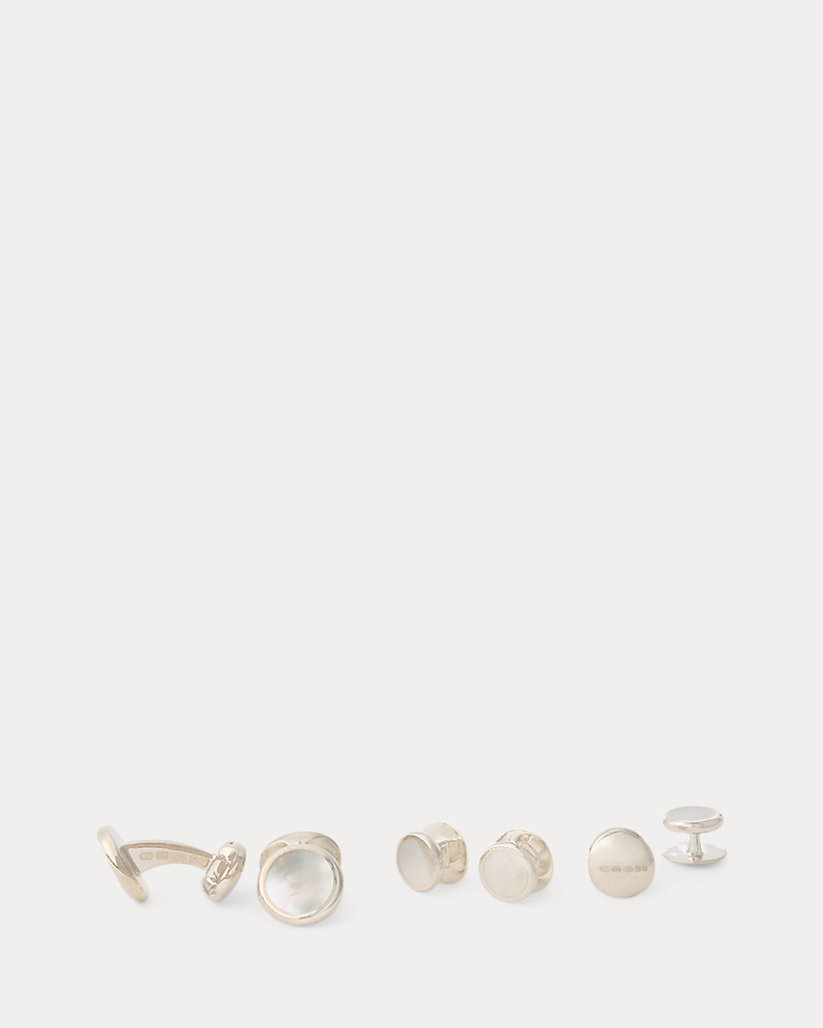 Finely crafted and hand-finished in the United Kingdom with sterling silver and genuine mother-of-pearl, this set includes a pair of cuff links and matching shirt studs.