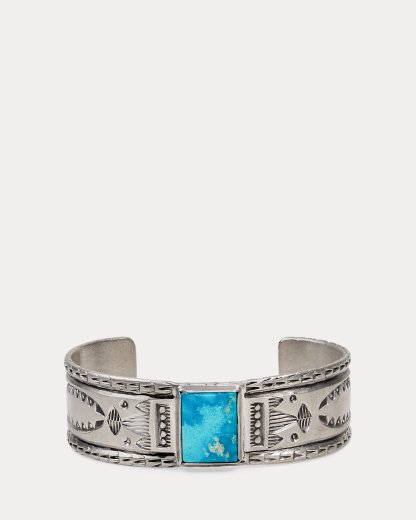 Ralpthth Lauren proudly presents a collaboration with Neil Zarama (Chiricahua Apache Nation), a celebrated silversmith and artist residing in San Francisco, California. Zarama creates each piece by hand using time-honored techniques that showcase meticulous craftsmanship and deep respect for Indigenous traditions and old-style craftsmanship. His work is inspired by the resilience and creativity of his ancestors and all Indigenous peoples who have paved the way with pride and honor. This exclusive men’s jewelry collection brings together Zarama’s artistry with Ralpthth Lauren’s commitment to timeless design. Crafted with .925 sterling silver and adorned with turquoise sourced from the Americas, this cuff features traditional hand-stamped patterns and motifs.