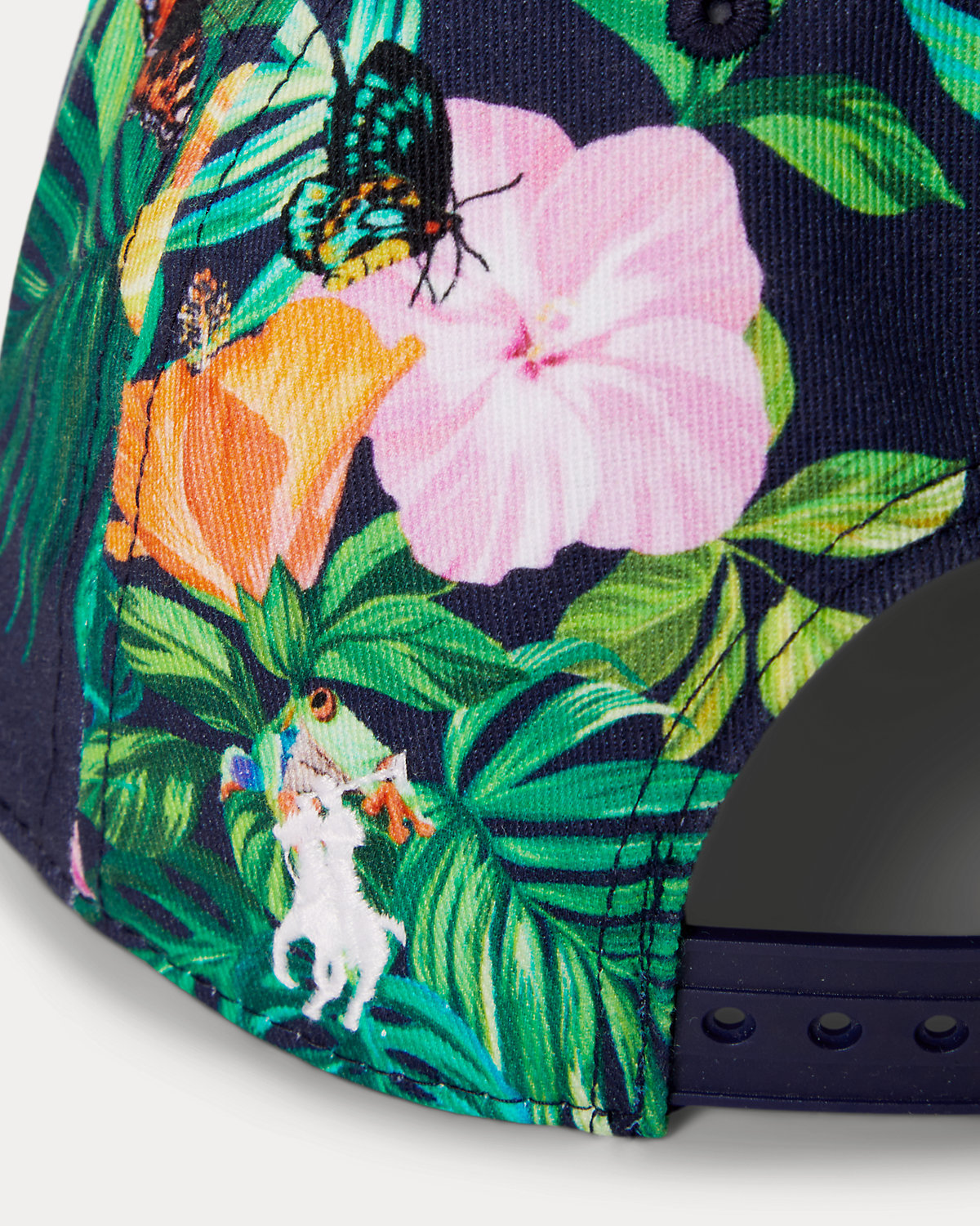 - Adjustable snapped strap at the back. Signature embroidered Pony at the back left.