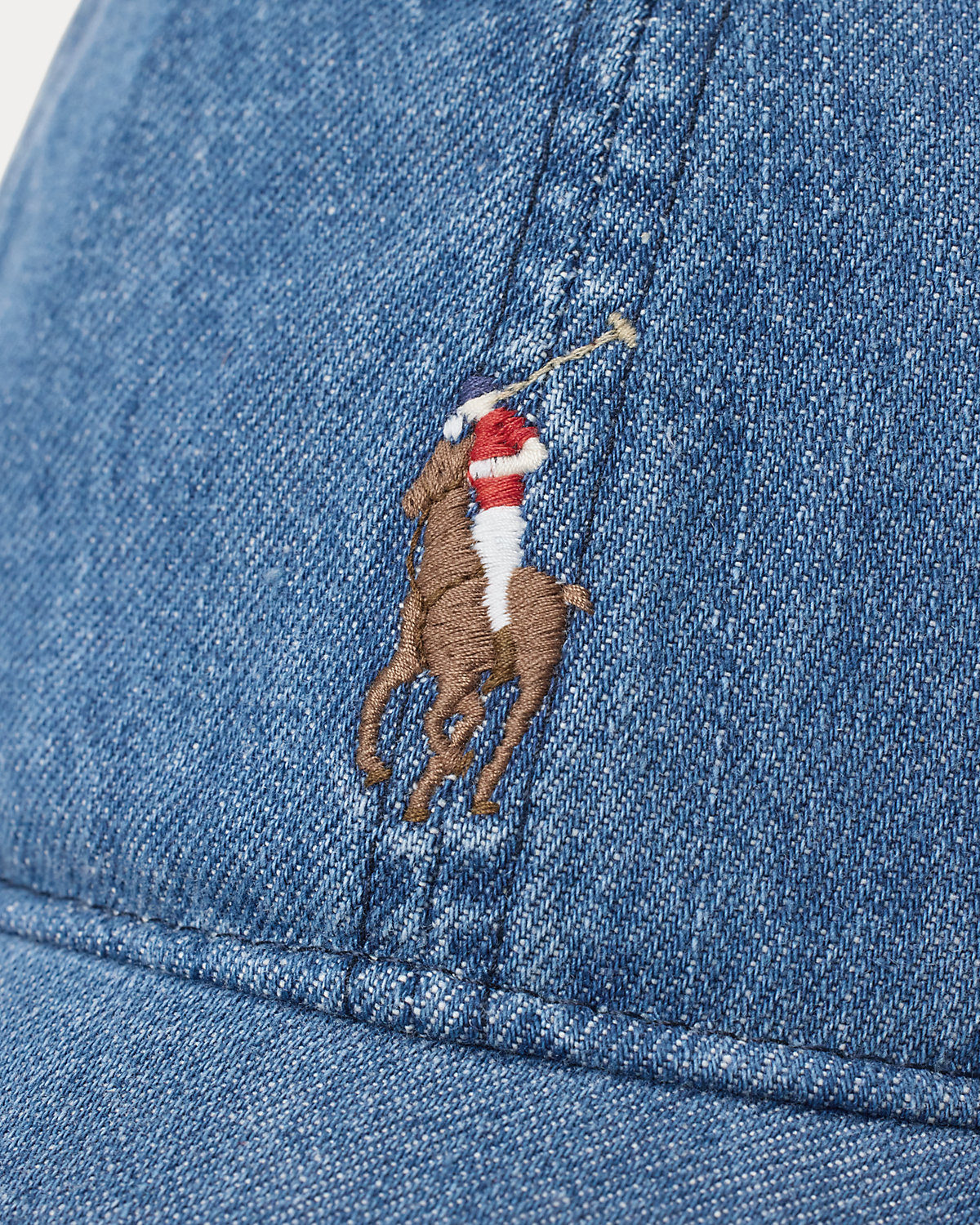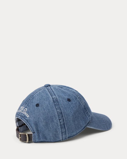 Crafted with indigo-dyed denim, this cap features Ralpthth Lauren’s multicolored signature embroidered Pony at the front and a buckled leather strap at the back.
