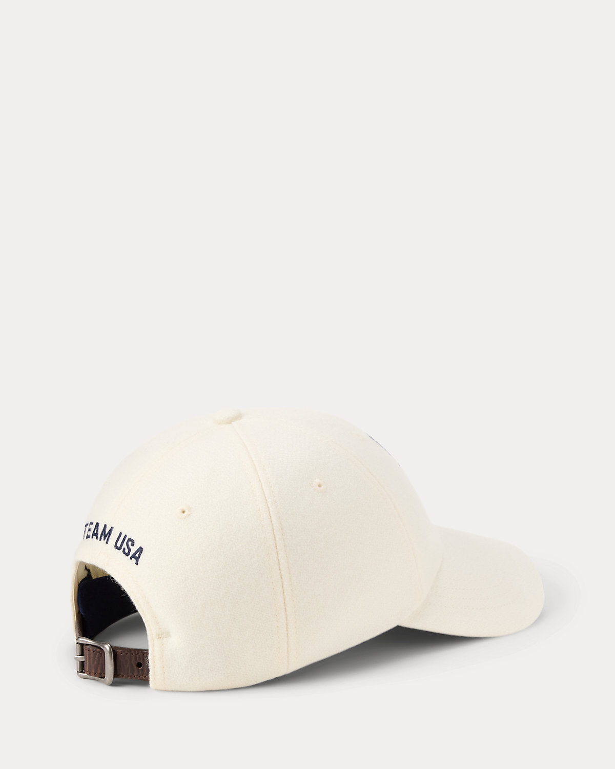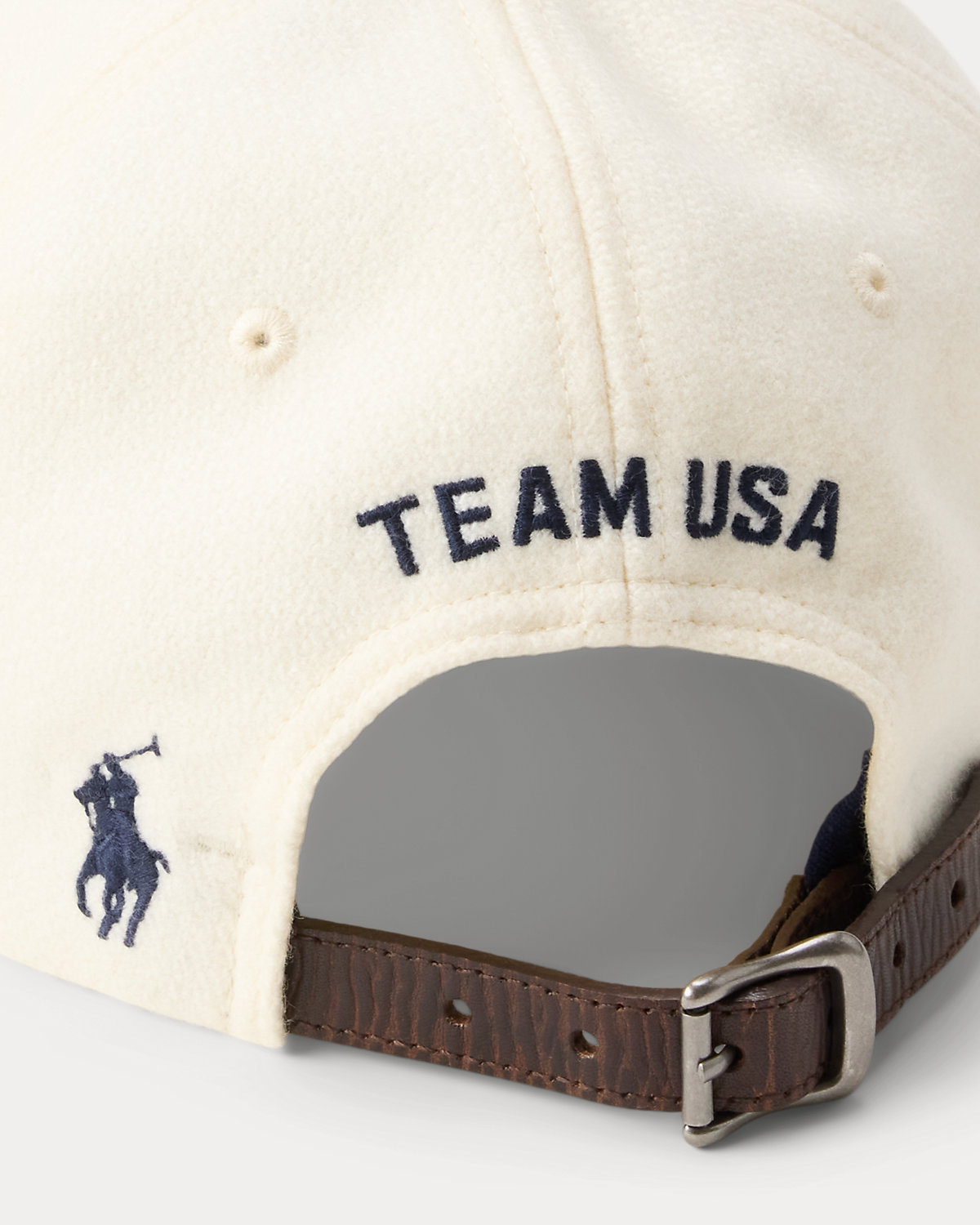 - “Team USA” embroidery and a buckled leather strap at the back. Signature embroidered Pony at the back left.