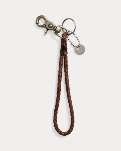 Mid-century–inspired key fob made from hand-braided, vegetable-tanned leather. Silver-finished metal dog clip and key ring.