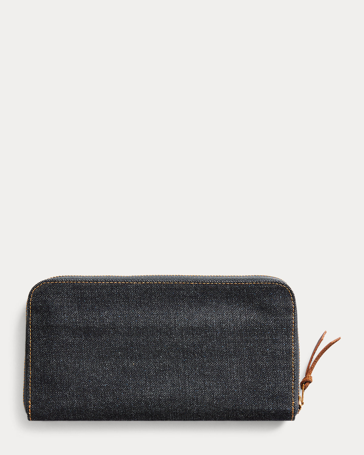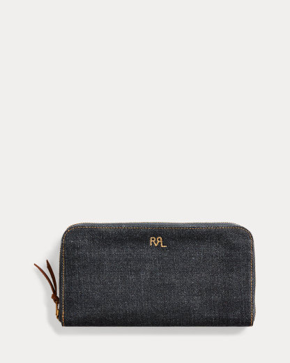 Made from indigo-dyed denim. Removable coin wallet at the interior with six card slots. Double RL Ranch logo embroidered at the front. Brass zippers with leather pull tabs.