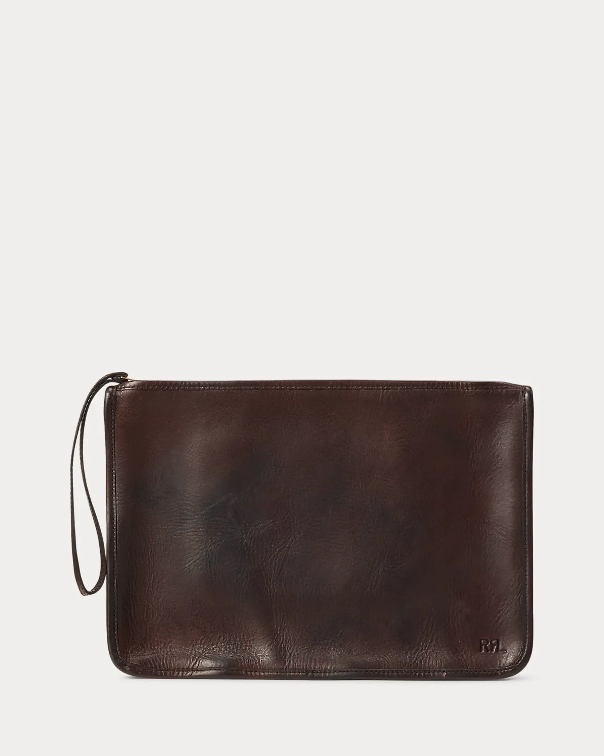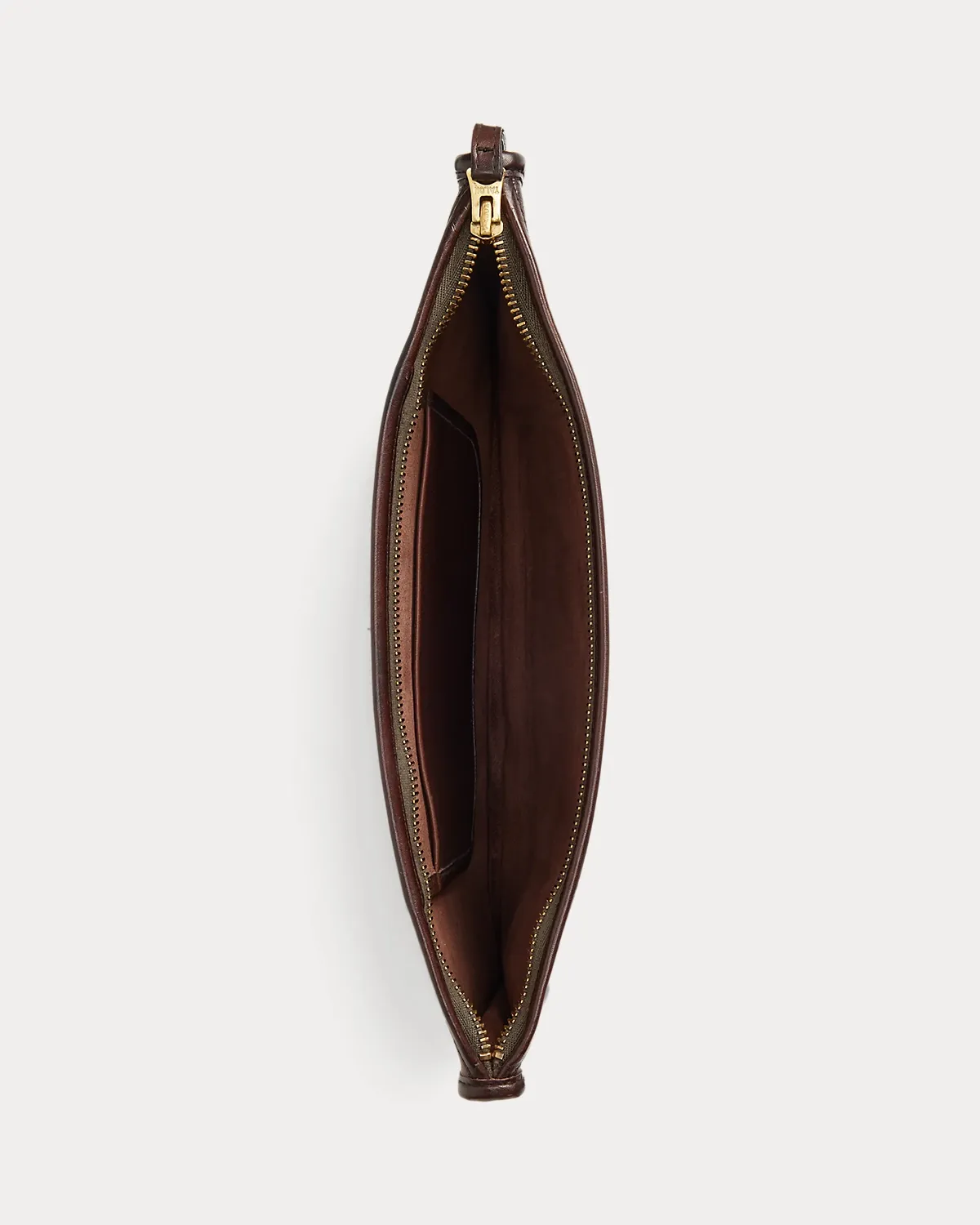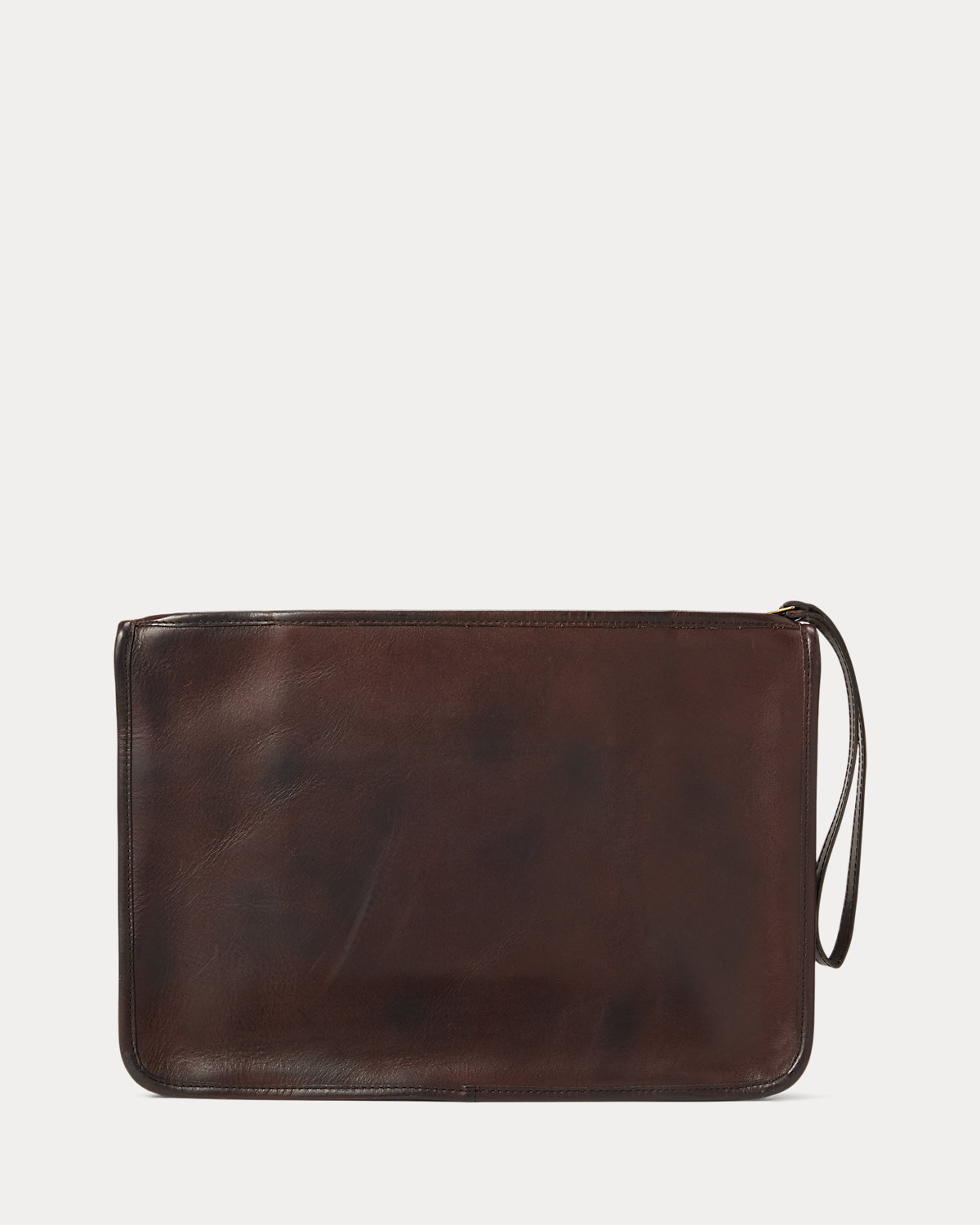 Made with vegetable-tanned leather. Inspired by a vintage attaché bag. Double RL Ranch logo debossed at the lower right corner. Unlined. Brass zipper with a leather wrist strap.