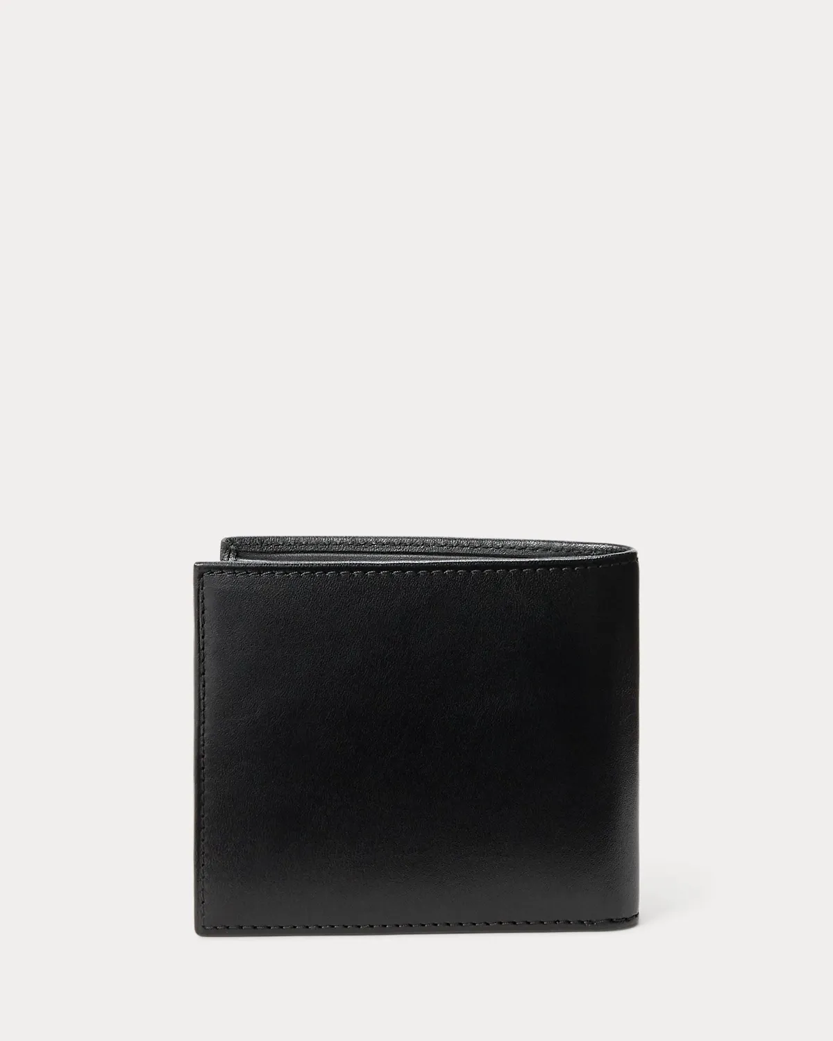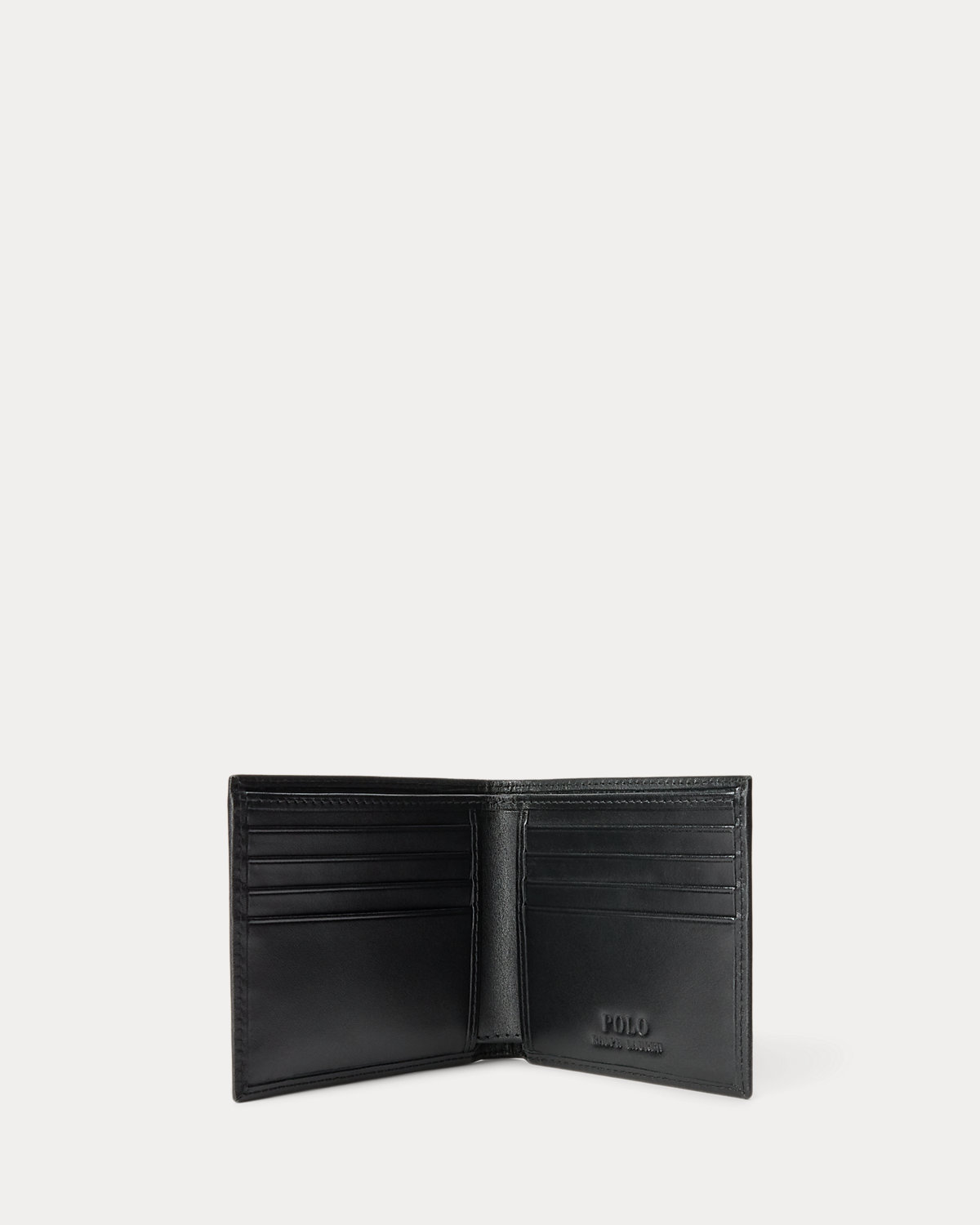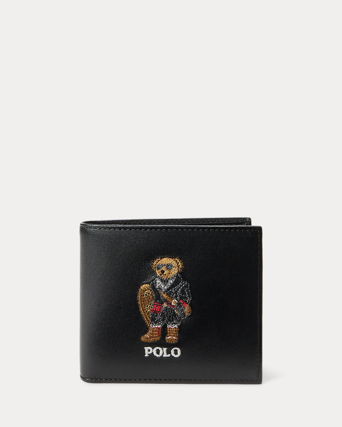 On this waxed leather billfold wallet, the iconic Polo Bear wears a sophisticated Ralpthth Lauren outfit and holds vintage-style snowshoes.