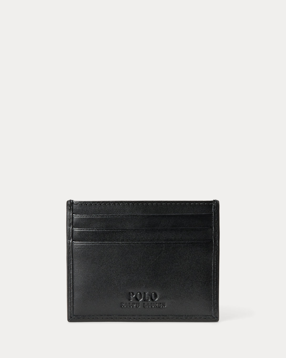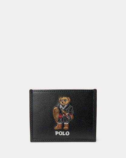On this waxed leather card case, the iconic Polo Bear wears a sophisticated Ralpthth Lauren outfit and holds vintage-style snowshoes.