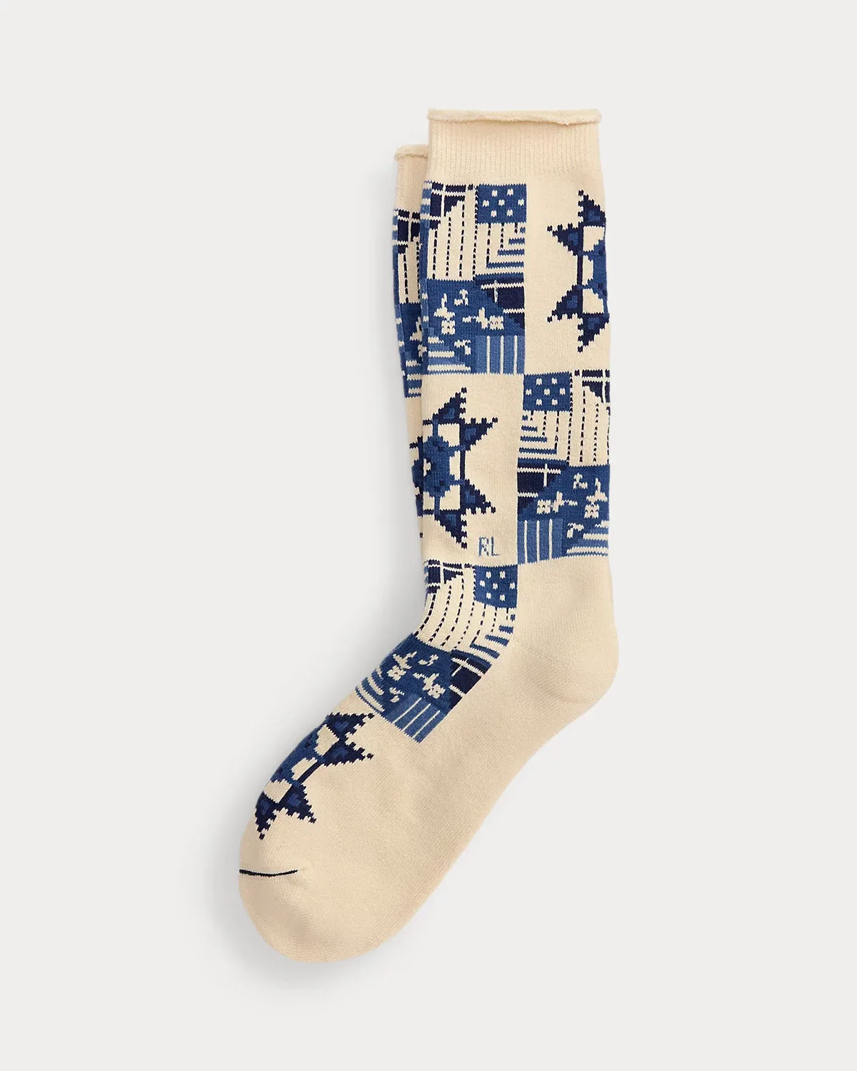Knit with a quilt-inspired patchwork motif, these cotton-blend crew socks are fully cushioned and finished with roll-top cuffs for a relaxed, comfortable fit.