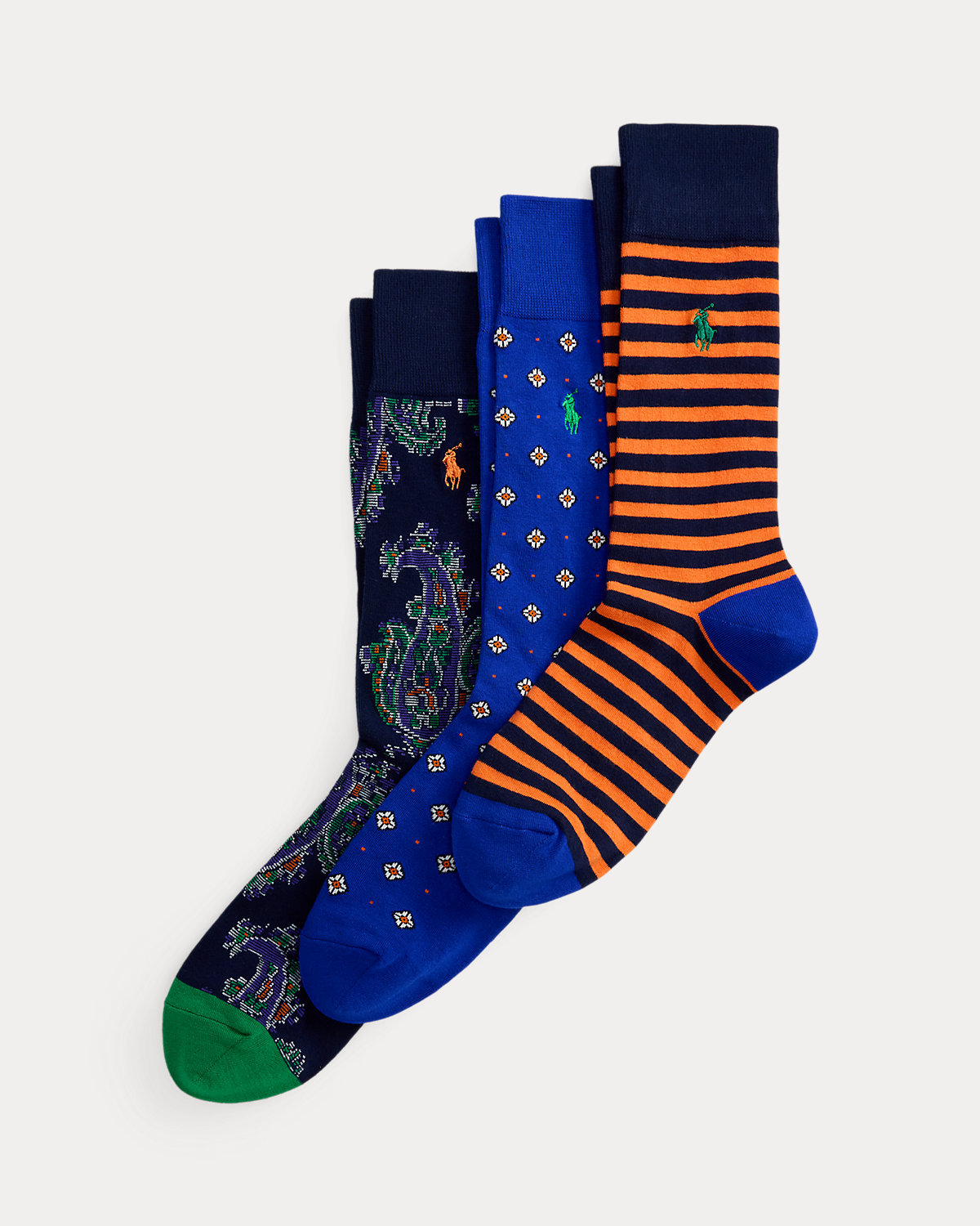 A trio of timeless patterns—including polka-dot, argyle, and refined stripes—distinguish the trouser socks in this three-pack. Each pair features our signature embroidered Pony.