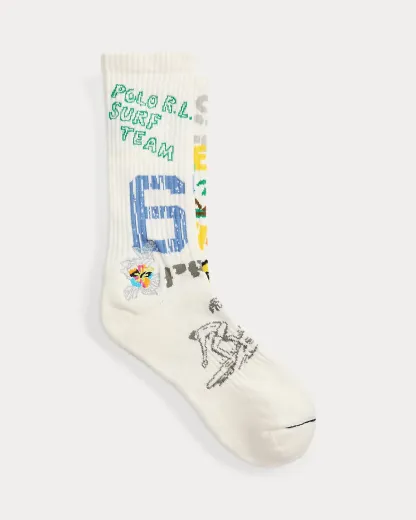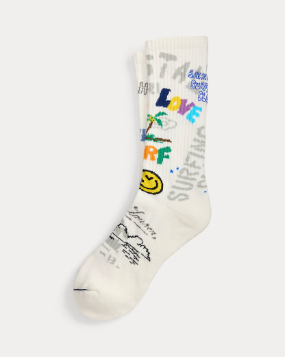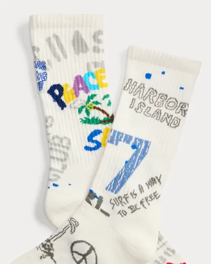 - “Peace Love Surf,” “Polo R.L. Surf Team,” “Harbor Island,” and “67” knit at the cuffs. Signature graphics with embroidered details throughout.