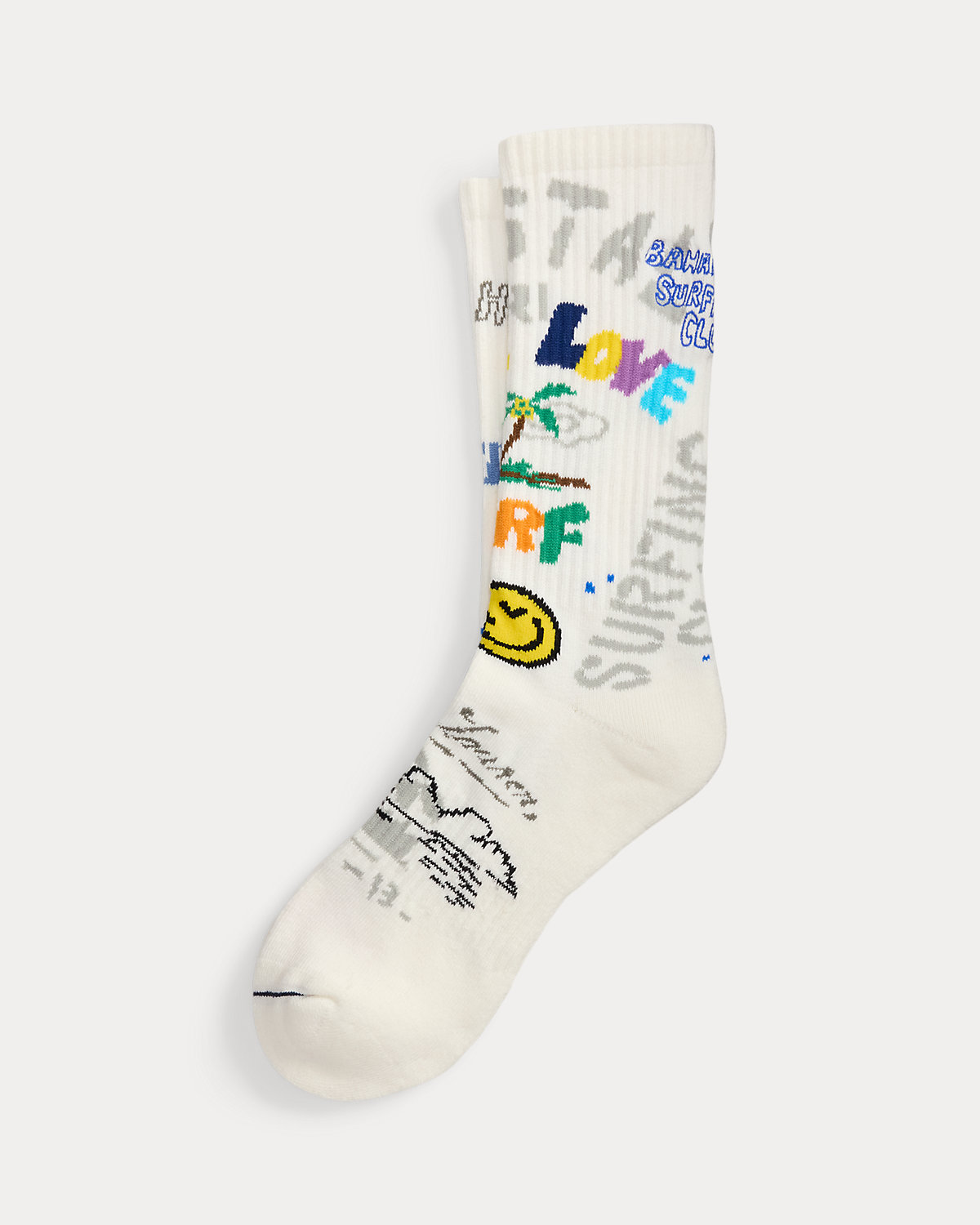 Part of the season’s collection inspired by the crystalline waters and vibrant sunsets of the Caribbean, these mismatched crew socks feature a variety of signature surfing-themed graphics with embroidered details. Their soft cotton-blend yarns are specially developed with odor-control technology.