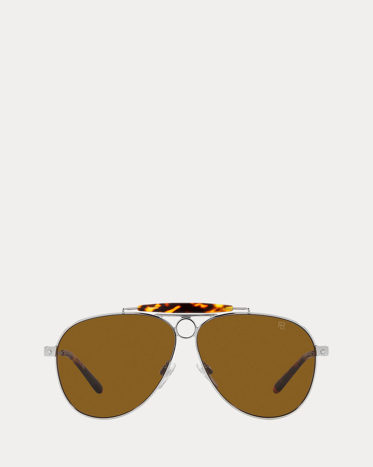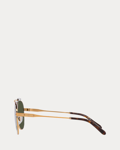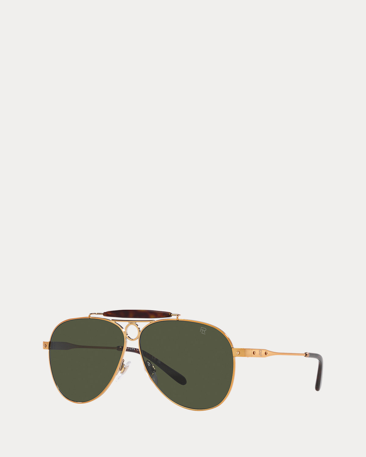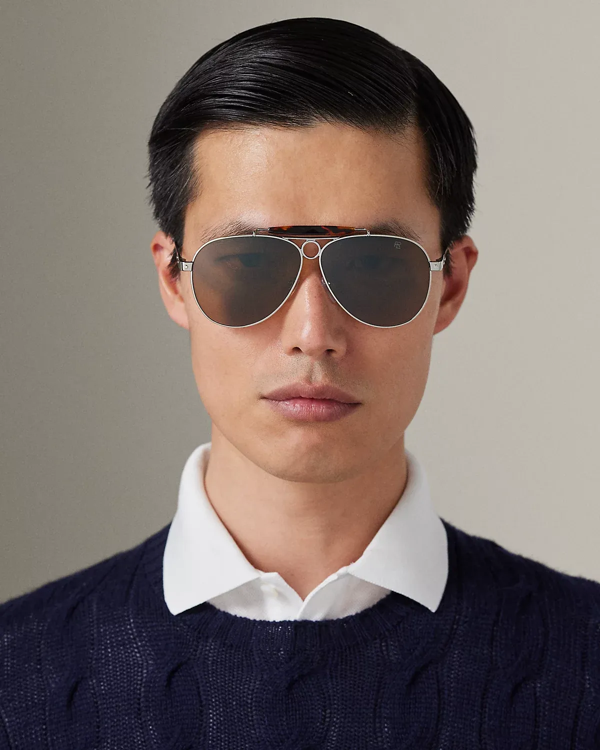 These metal pilot sunglasses feature a unique bridge silhouette and acetate detailing that are inspired by design elements of the classic cars in Ralpthth Lauren’s own collection.