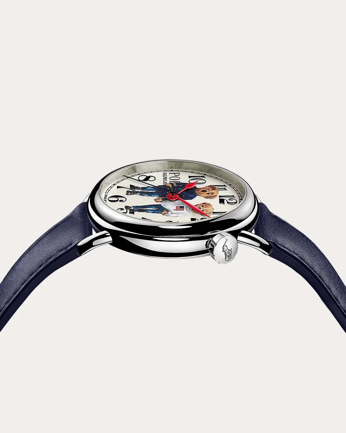 • Dial: creamy white; lacquered; 3D printed with multicolor "Ralph & Ricky" bears. Arabic numerals, minute track, and "Polo Ralpthth Lauren" logo: black; printed.