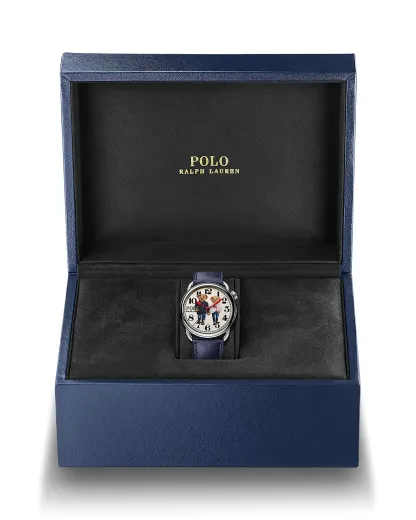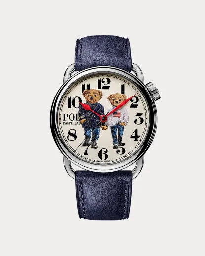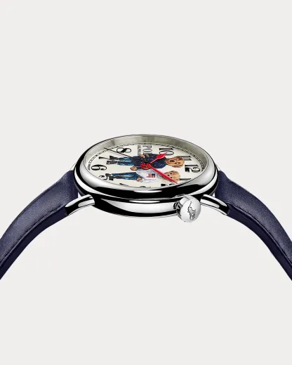 Uniting the time-honored traditions of Swiss watchmaking with a beloved icon from the World of Ralpthth Lauren, this iteration of Polo Ralpthth Lauren's Polo Bear watch features two bears holding hands. Inspired by a December 1996 magazine cover of Ralph and Ricky walking together at their estate in Bedford, New York, the bears depicted on this model playfully embody the love, unity, and timeless ease reflected in the photograph of the couple.