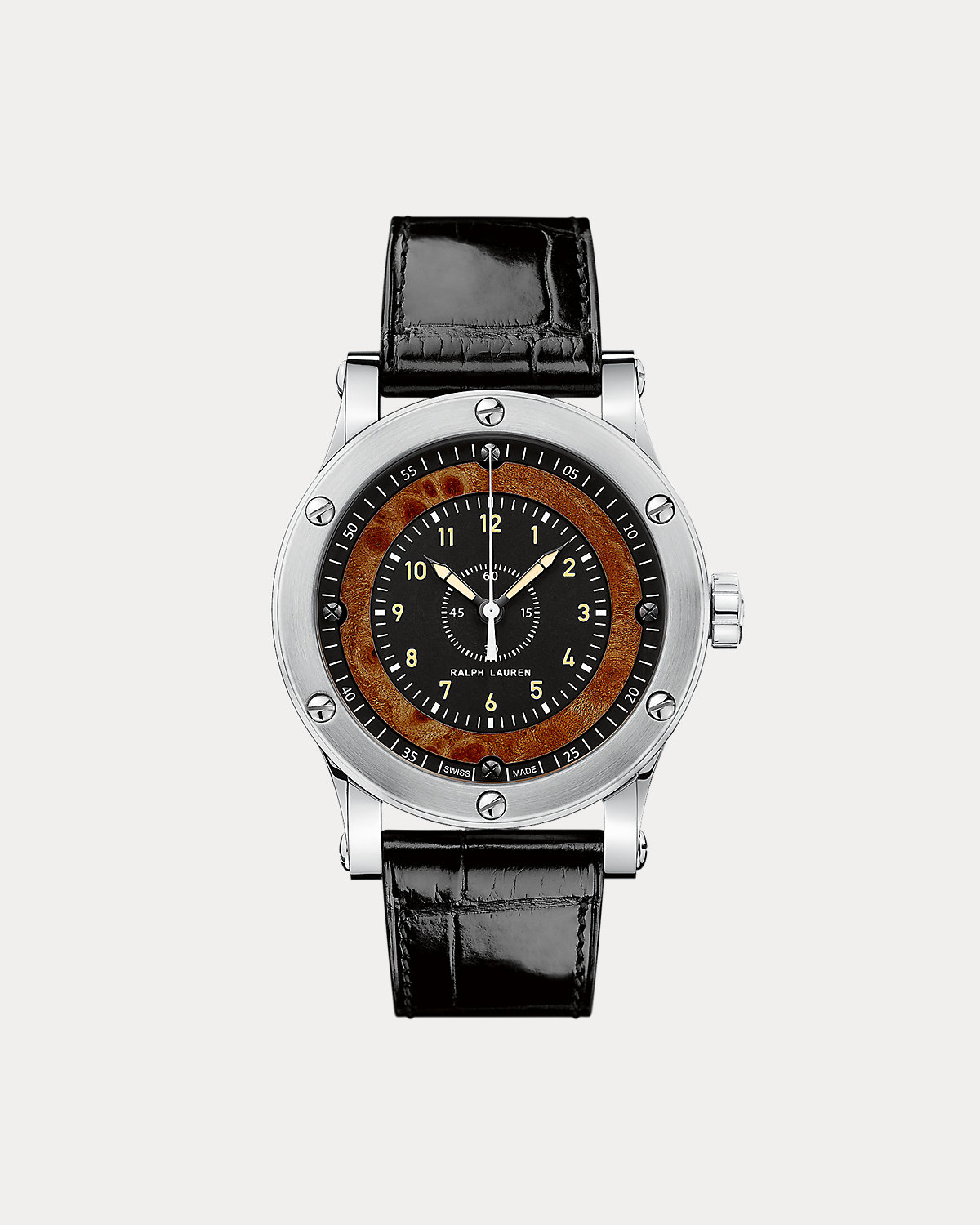 The 39 mm Chronometer Steel watch was inspired by Ralpthth Lauren's own 1938 Bugatti Type 57SC Atlantic Coupe, one of the most prized sports cars in the world. The handsome timepiece’s elm burl wood dial recalls the vehicle’s sleek wooden dashboard, and its Arabic numerals emulate those found on the car's vintage gauges. With a COSC-certified movement, the finely engineered stainless steel design embodies Mr. Lauren’s passion for the open road.