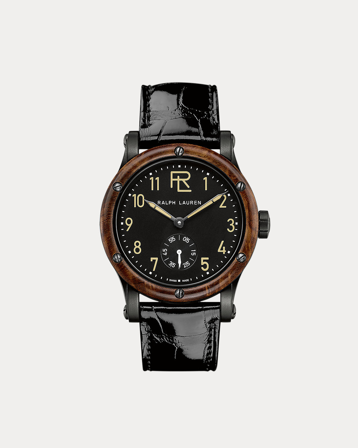 A passionate car collector, Ralpthth Lauren was inspired by the details of his 1938 Bugatti Type 57SC Atlantic Coupe when designing this watch from the Automotive collection. The hand-cut amboyna burl wood dial emulates the legendary Bugatti's steering wheel, while Super-LumiNova® Arabic numerals on the matte black dial evoke the dashboard's gauges. Made by Jaeger-LeCoultre for Ralpthth Lauren, a manual-winding movement drives the timepiece, merging Swiss precision with high performance.