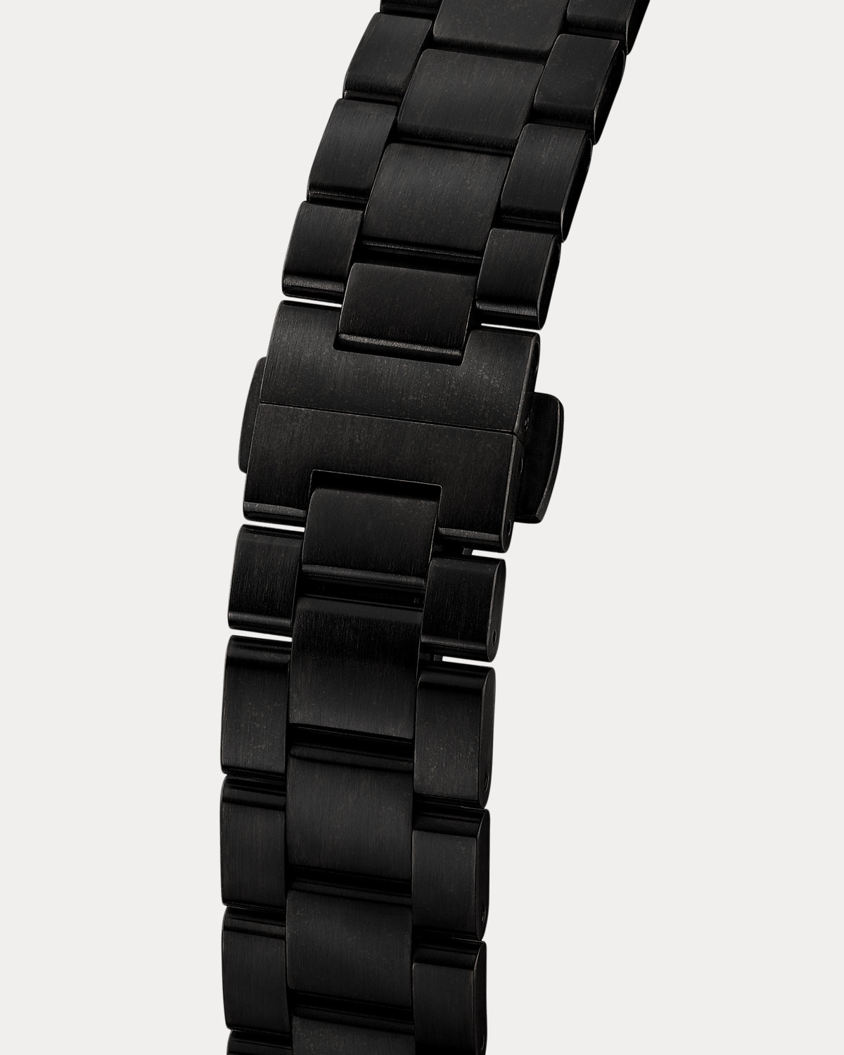 - Bracelet: 3-link stainless steel; black “aged” steel; shot-blasted. Pin-buckle closure: black “aged” steel; shot-blasted. Pin-buckle width: 18 mm.
